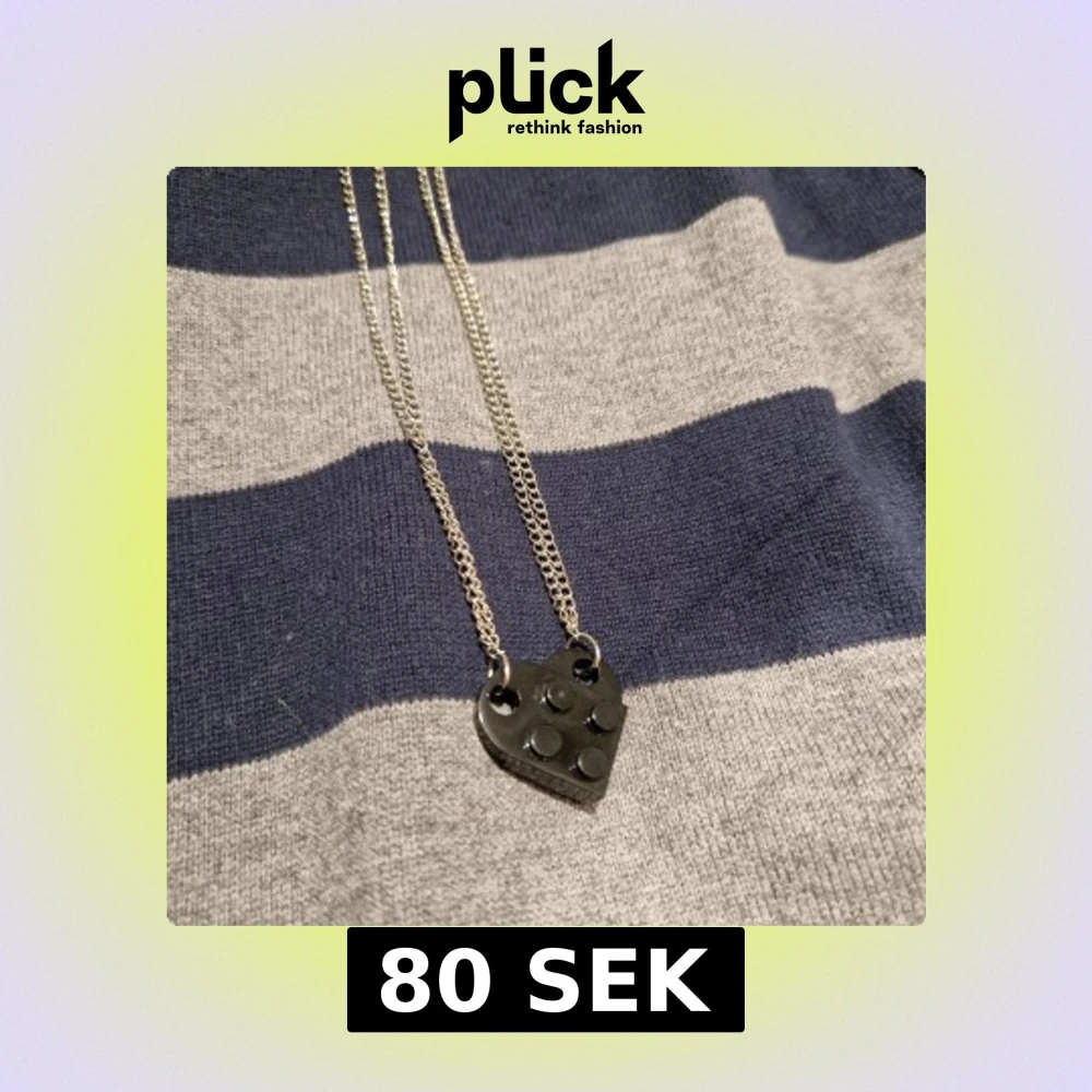 Två halsband med varsinn legobit som tillsammans formar ett hjärta. Kedjorna är tunna och silverfärgade.