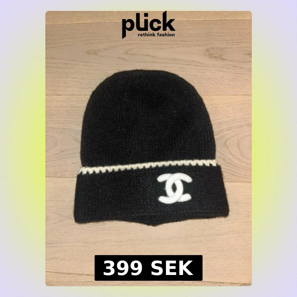 Snygg svart stickad mössa med vit kant och den klassiska CC-loggan framtill. Mössan har en enkel, rundad form och är perfekt för att lyfta din outfit med en lyxig touch. Materialet är mjukt och värmande, passar perfekt för kyliga dagar.