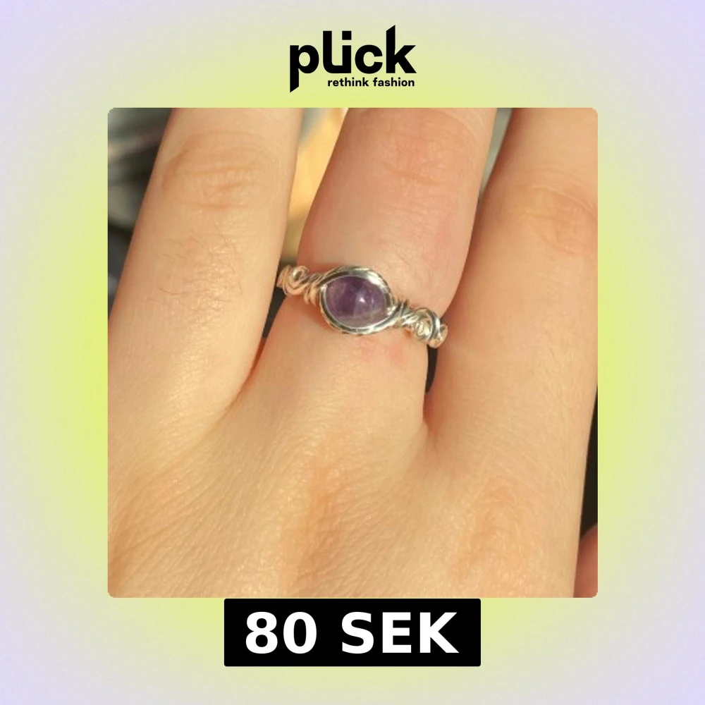 Unik handgjord ring i silverfärgad metalltråd med en rund, lila sten i mitten. Snygga snirkliga detaljer runt stenen ger ringen en bohemisk vibe. Perfekt för dig som gillar personliga smycken med lite extra karaktär.