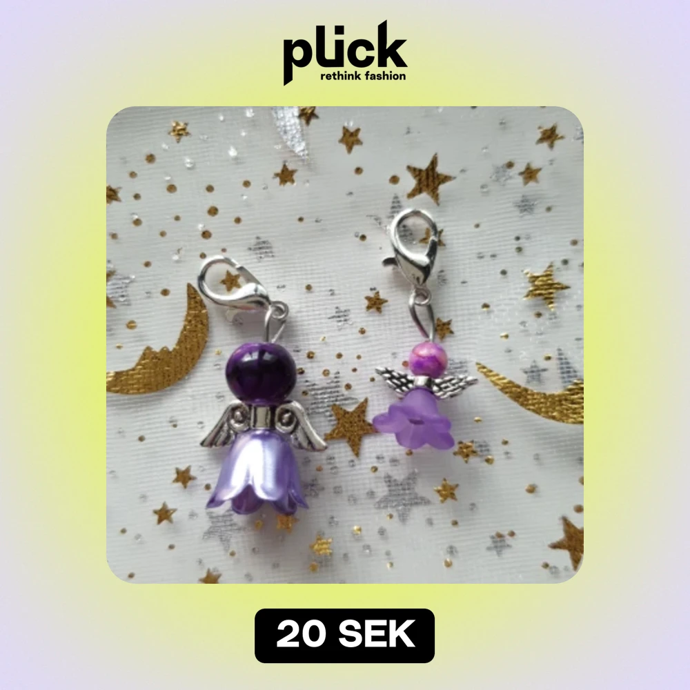 Två supersöta ängelberlocker i lila nyanser. Den ena har en större lila pärla som huvud och en blomformad kjol, medan den andra har en mindre pärla och en liknande kjol. Båda har små silverfärgade vingar och en praktisk klämma för att fästa dem på ett armband eller halsband. Perfekta för att ge en magisk touch till dina smycken!