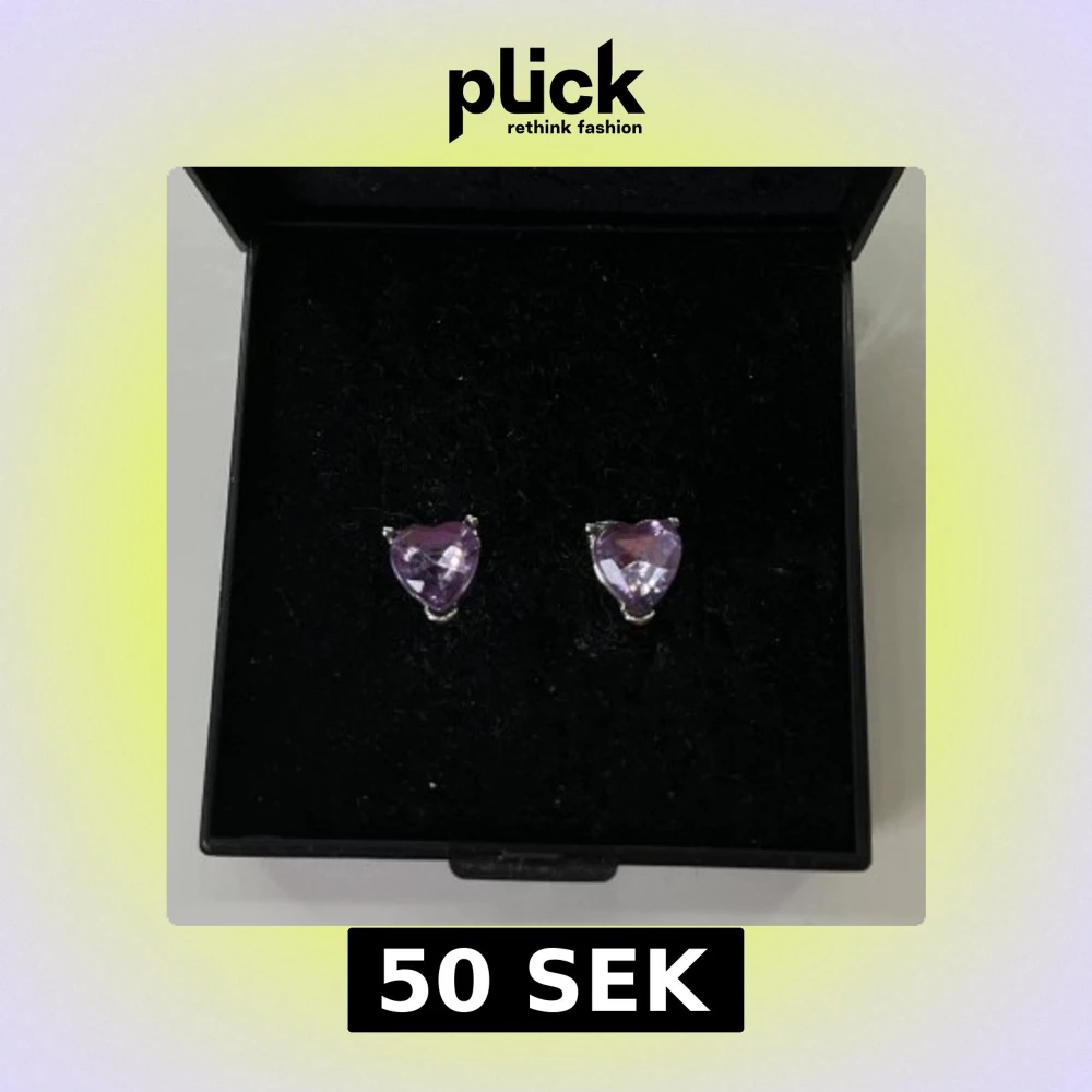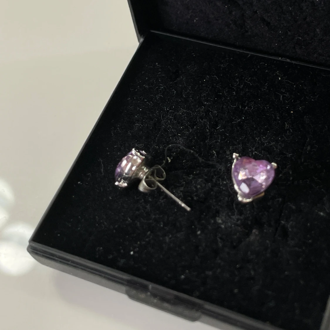 Säljer ett par söta örhängen med lila, hjärtformade stenar infattade i silverfärgad metall. Perfekta som en färgglad detalj till din look. Ej riktigt silver.