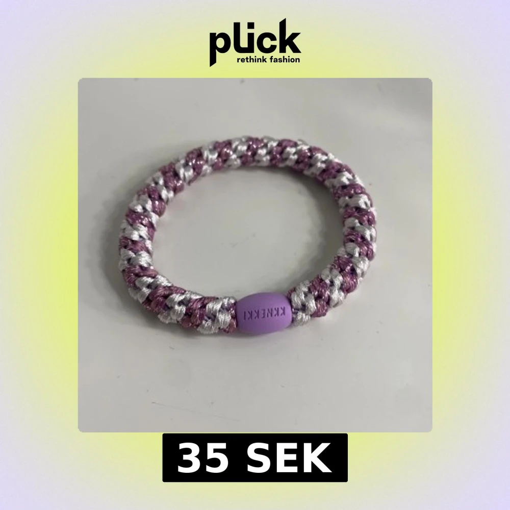 Säljer ett flätat armband från KNEKKI i lila och silver. Armbandet har ett coolt randigt mönster och en lila pärldetalj med märkesnamnet ingraverat. Perfekt accessoar för att ge din outfit lite extra färg och stil.