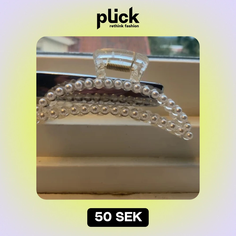 En klämma från Lindex.Genomskinlig med vita pärlor på.inte jätte stor men det passar bra till alla går typer.