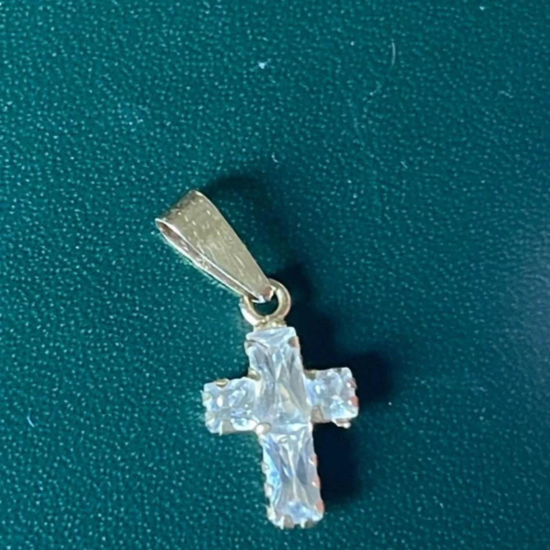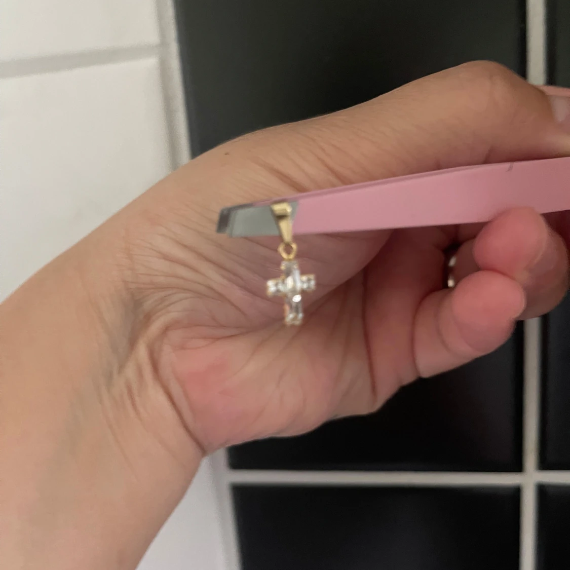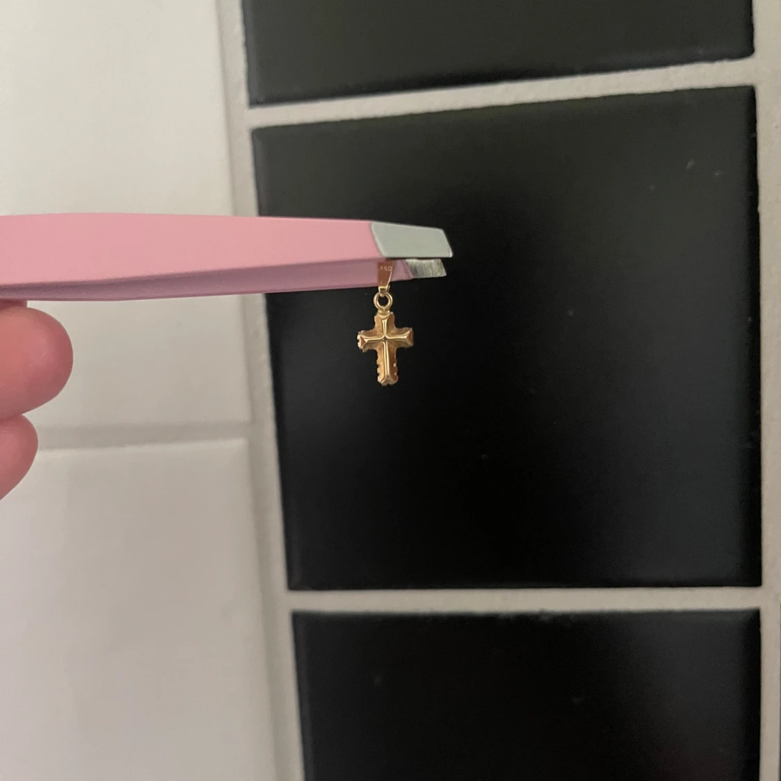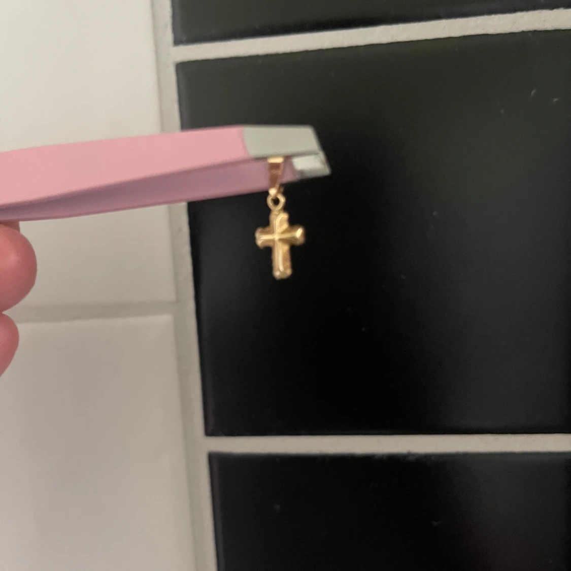 Säljer en liten och stilren korsberlock i guld med gnistrande stenar stämpel 750 Perfekt att hänga på ett halsband . Korset har en klassisk form och detaljerad. Köptes på guldfynd för nåt år sen.