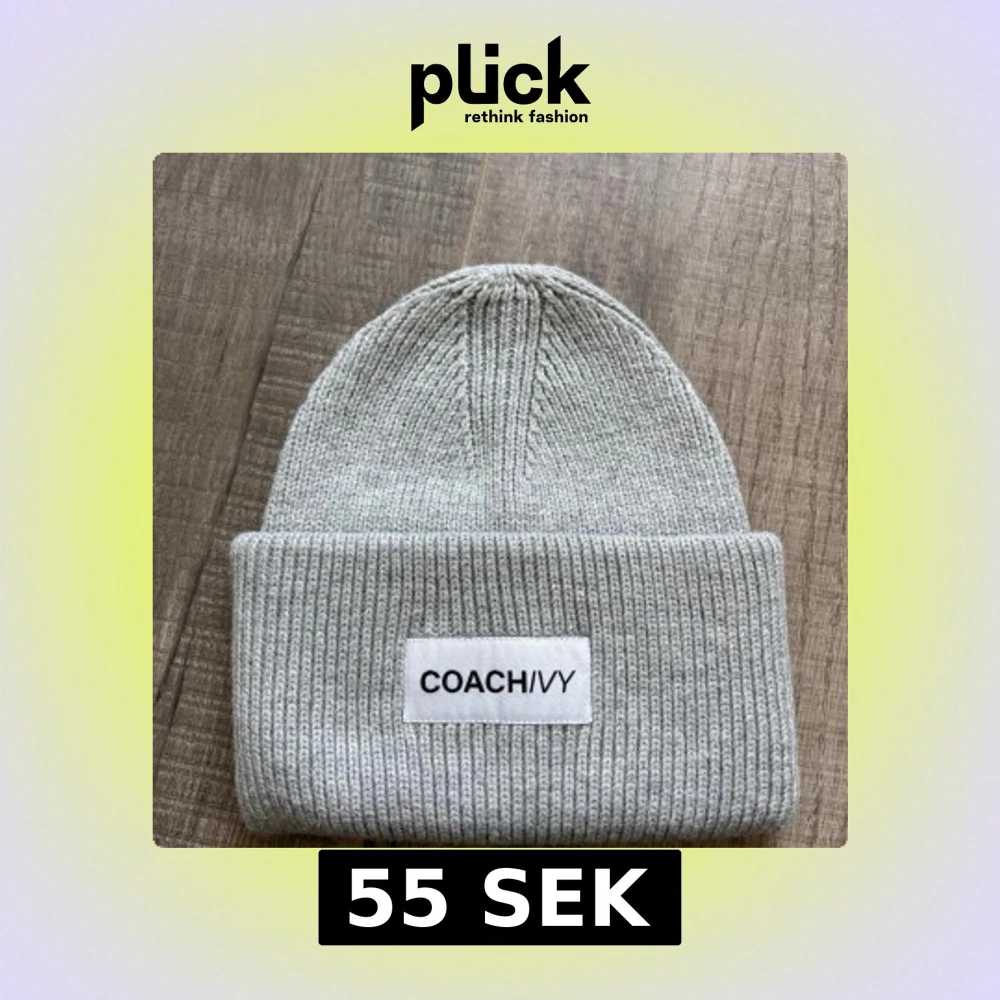 Säljer en stilren ljusgrå ribbstickad mössa från COACH IVY. Mössan har en bred uppvikt kant och en vit patch med svart logga framtill. Perfekt accessoar för kyliga dagar och enkel att matcha med olika outfits.