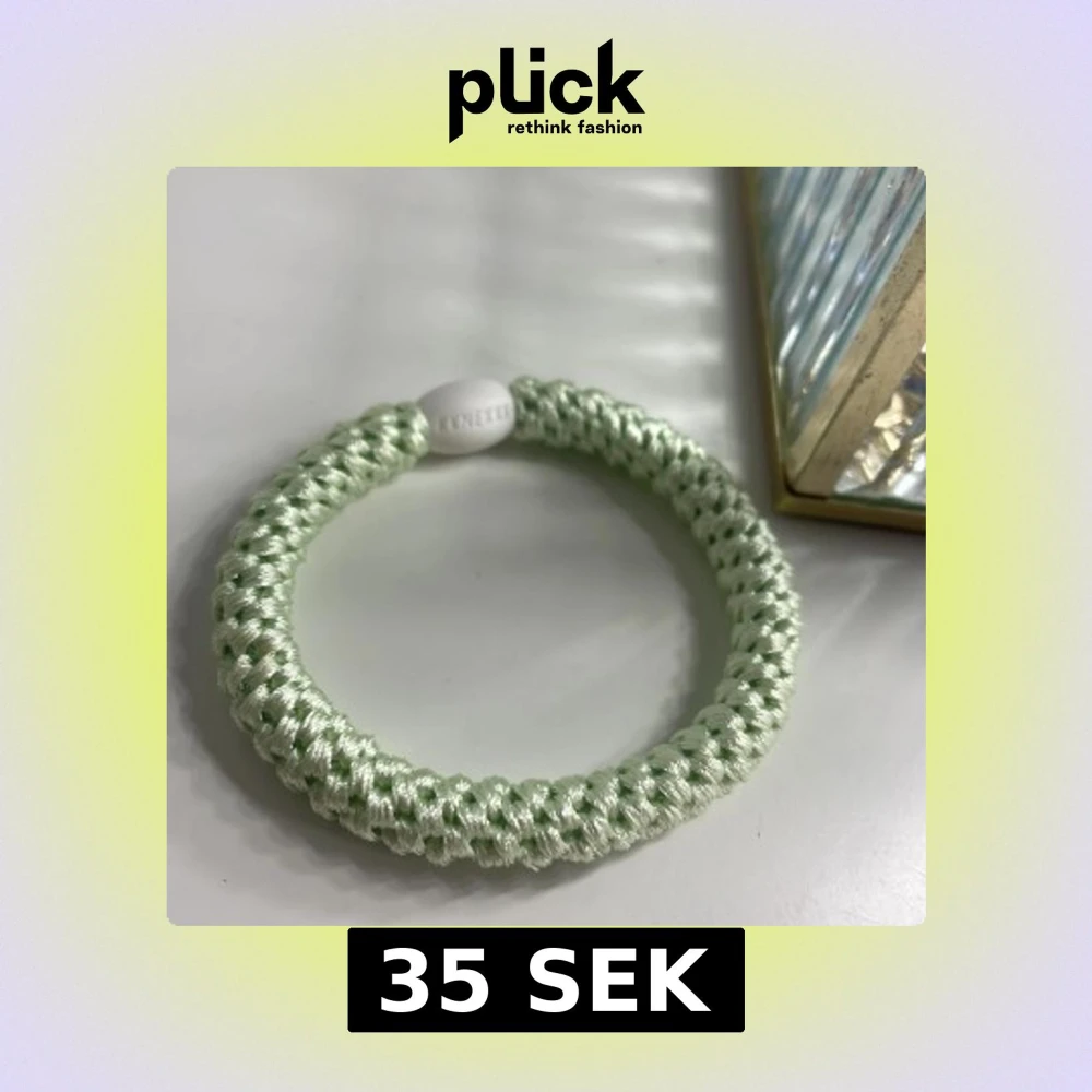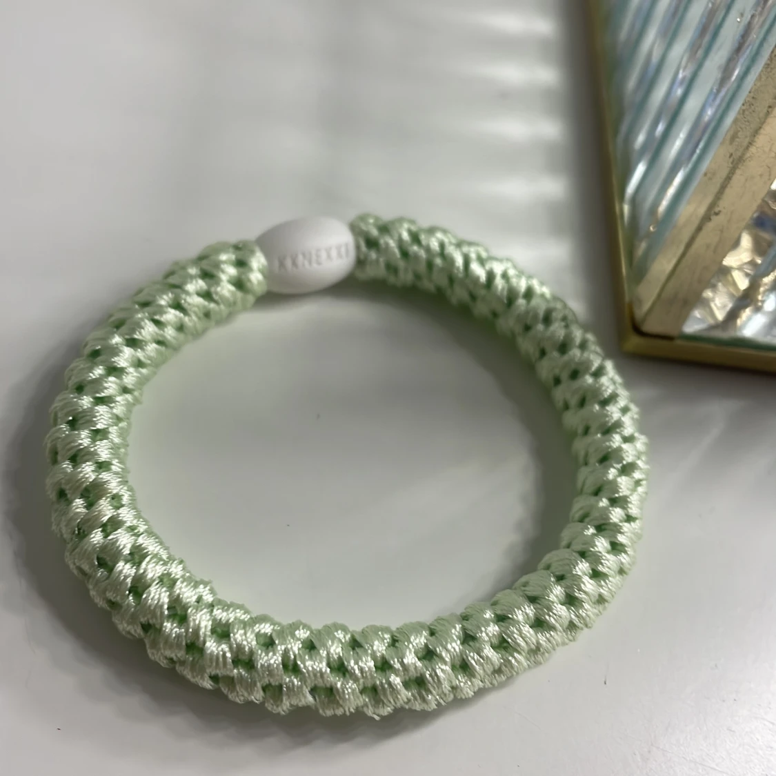 Snyggt ljusgrönt armband från Kynexxi med flätad design och glansig finish. Armbandet har en rund form och ett vitt märke med logga. Perfekt accessoar för att lyfta din outfit med en fräsch färgklick.