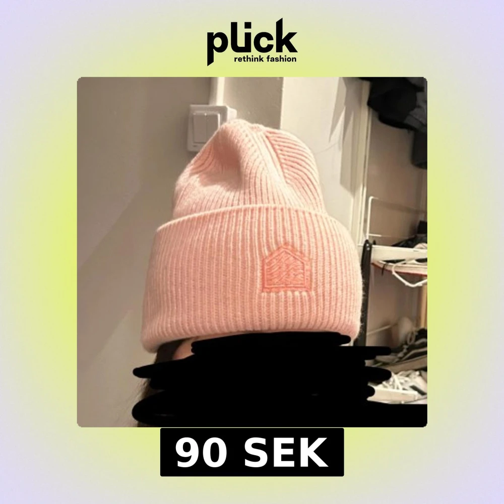 Säljer en ljusrosa ribbstickad mössa med uppvikt kant och broderad logga framtill. Enkel och stilren design som passar till det mesta.