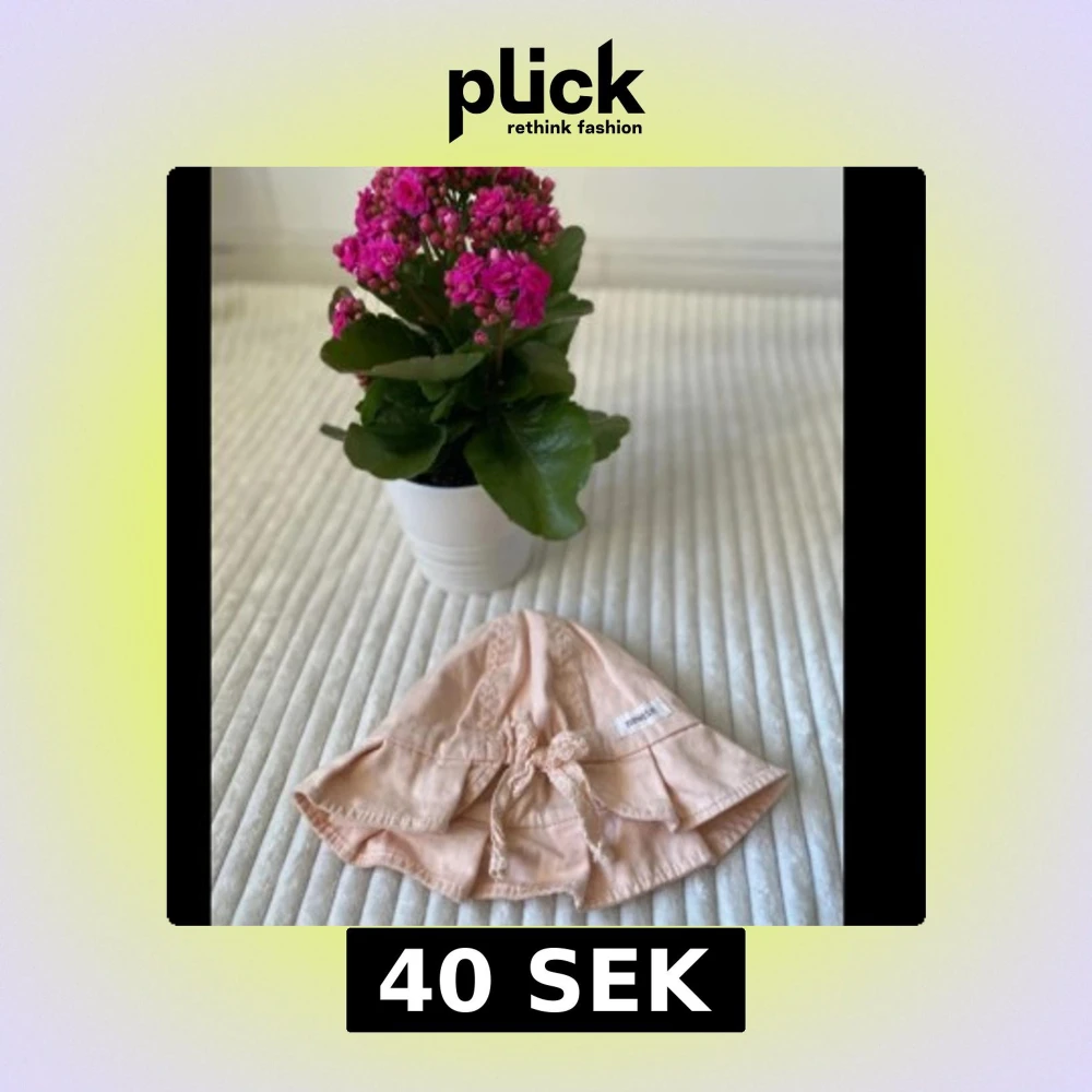 Supersöt ljusrosa solhatt från Newbie i mjuk bomull. Hatten har bred brätte och fina knytband i spets framtill. Perfekt för soliga dagar och ger en gullig vintagekänsla till outfiten.