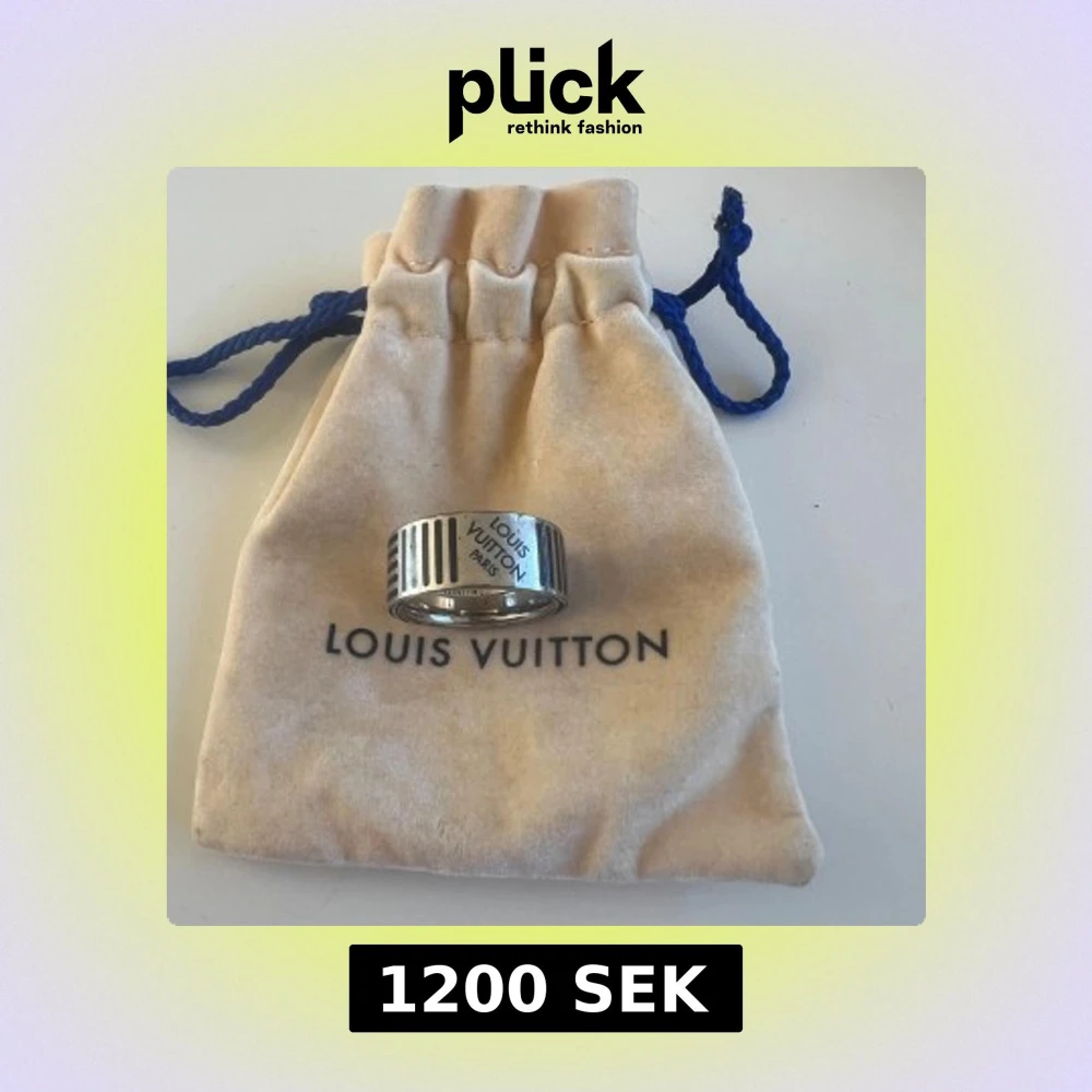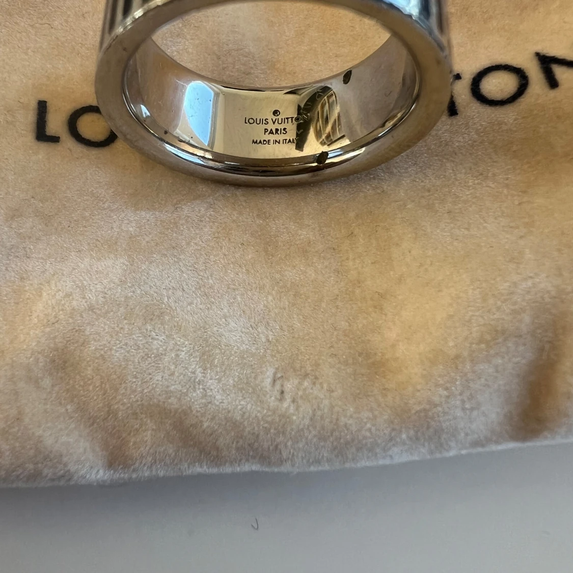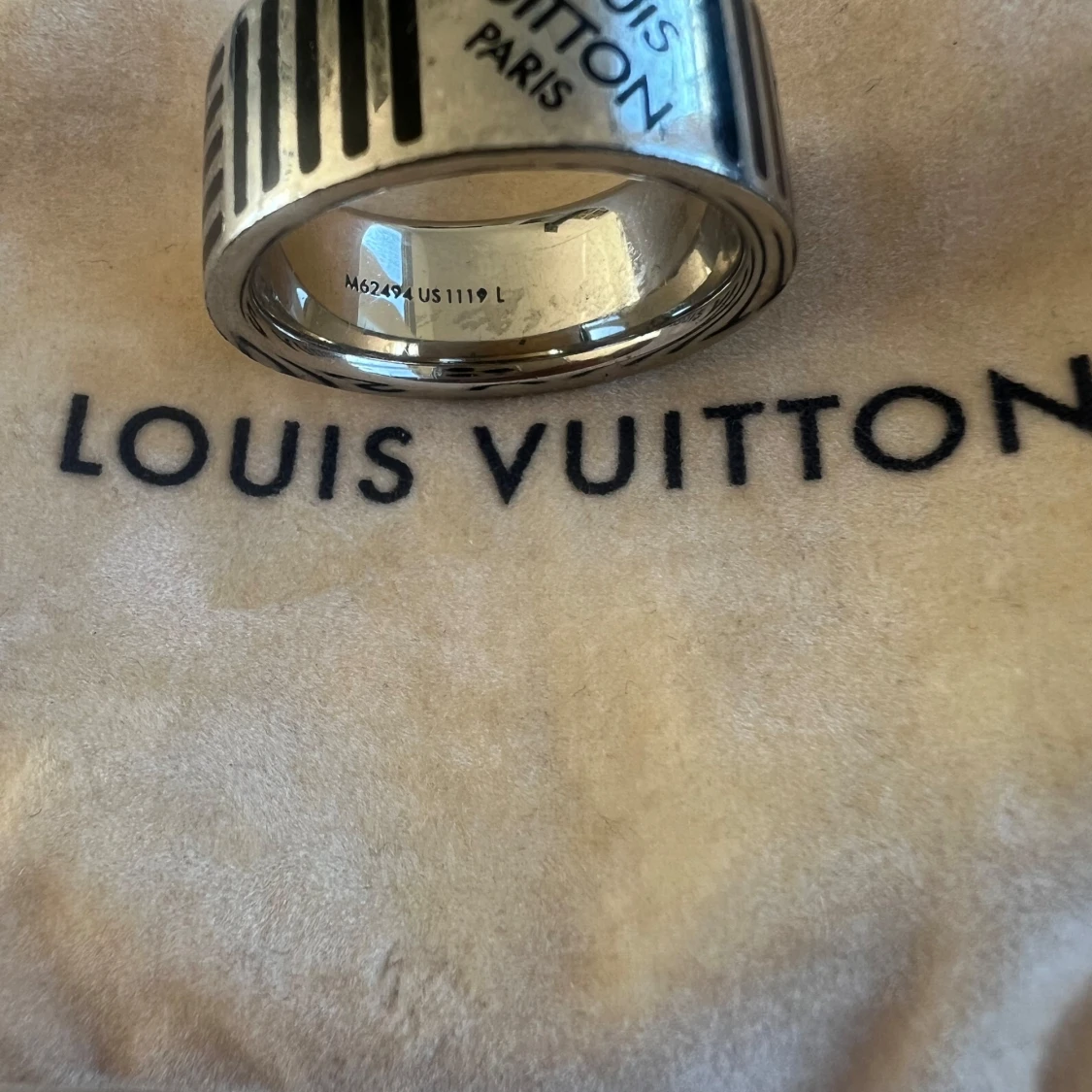 Säljer en bred, silverfärgad ring från Louis Vuitton med graverade vertikala linjer och märkets logotyp. Ringen är i metall och har en modern, stilren design. Perfekt för dig som gillar exklusiva accessoarer. Kvitto och box medföljer