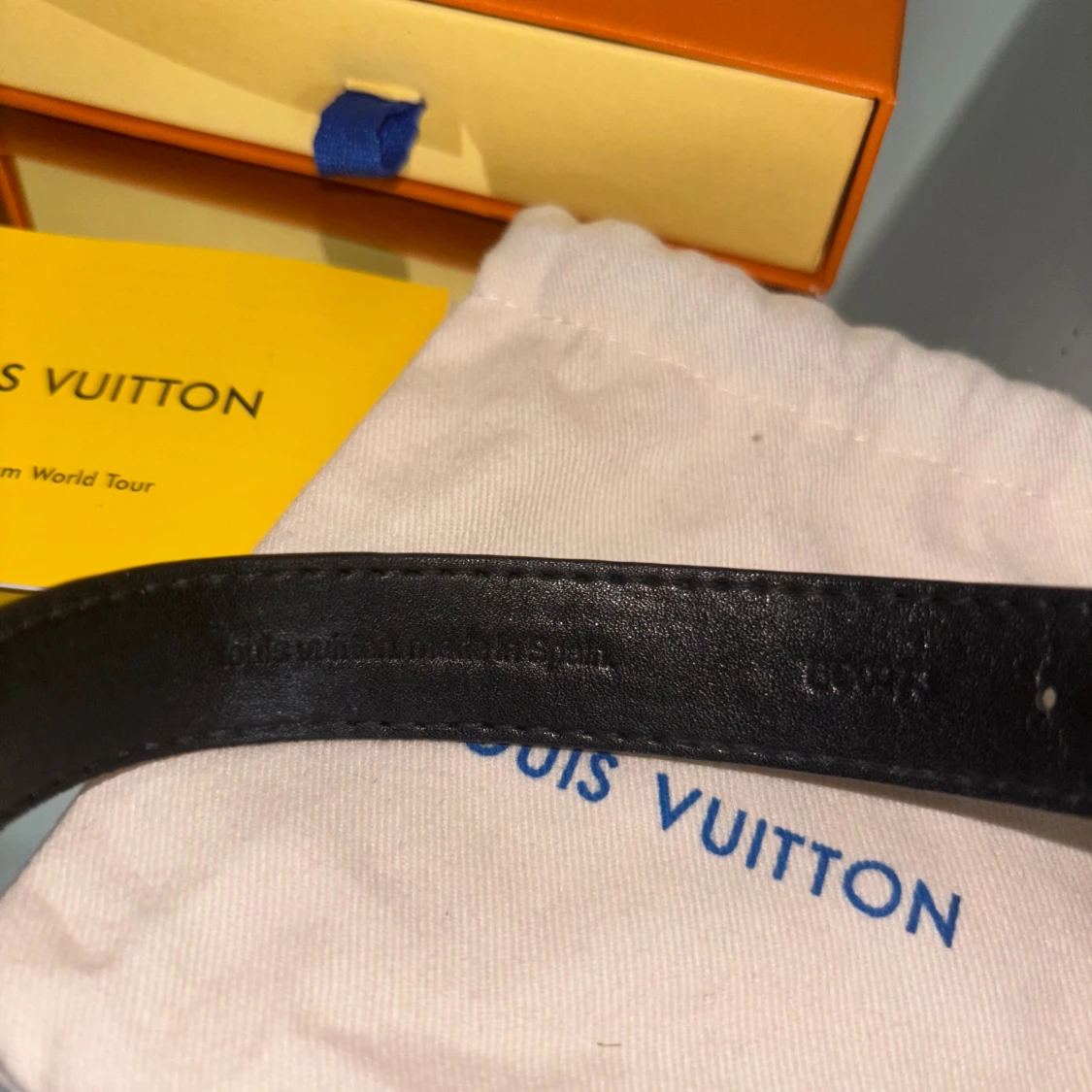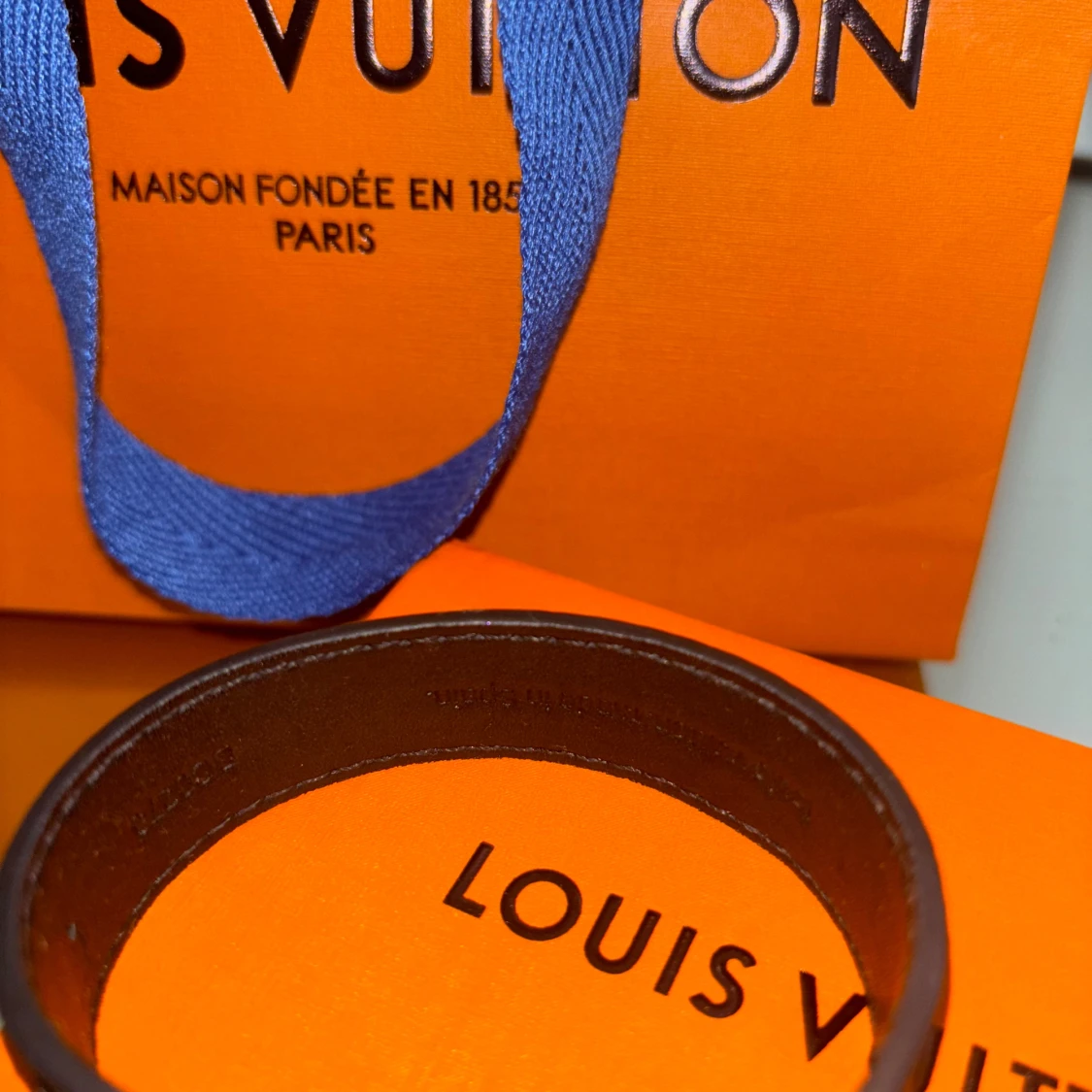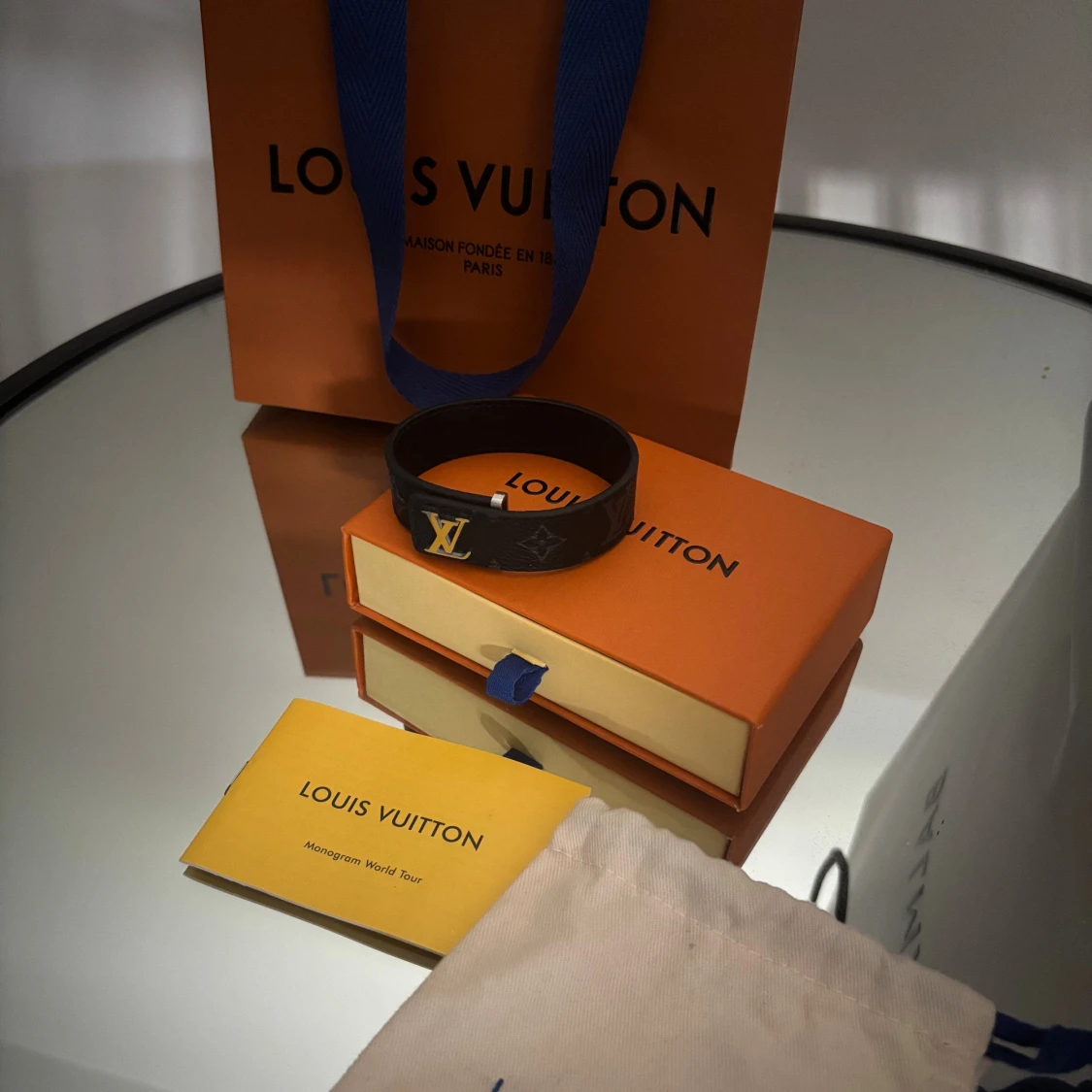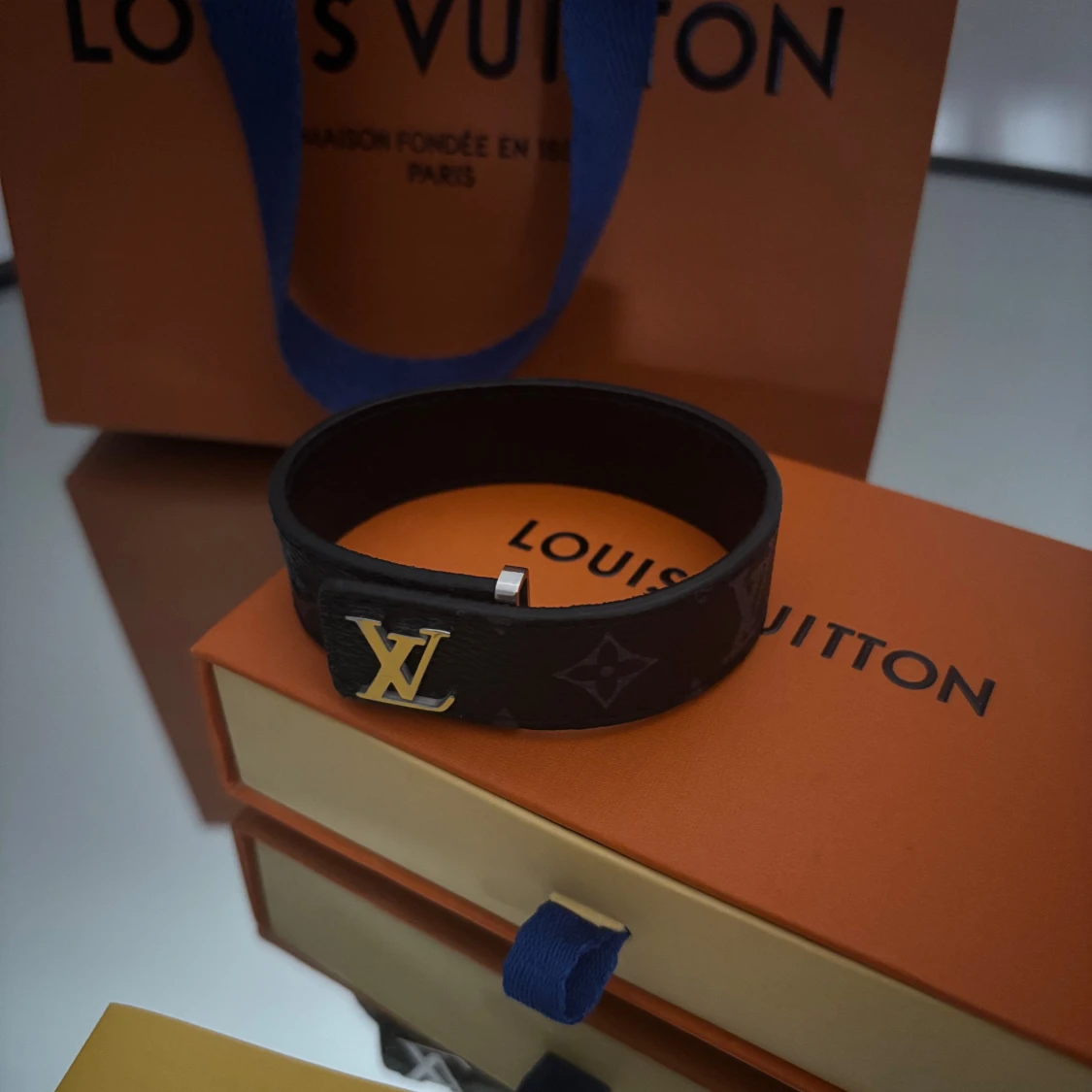Stilrent armband från Louis Vuitton i svart skinn med klassiskt monogrammönster och guldfärgad LV-logga framtill. Armbandet har en enkel och snygg design som ger en lyxig känsla. Perfekt accessoar för dig som gillar exklusiva detaljer. Kvitto bevis finns! Box tillbehör medföljer!