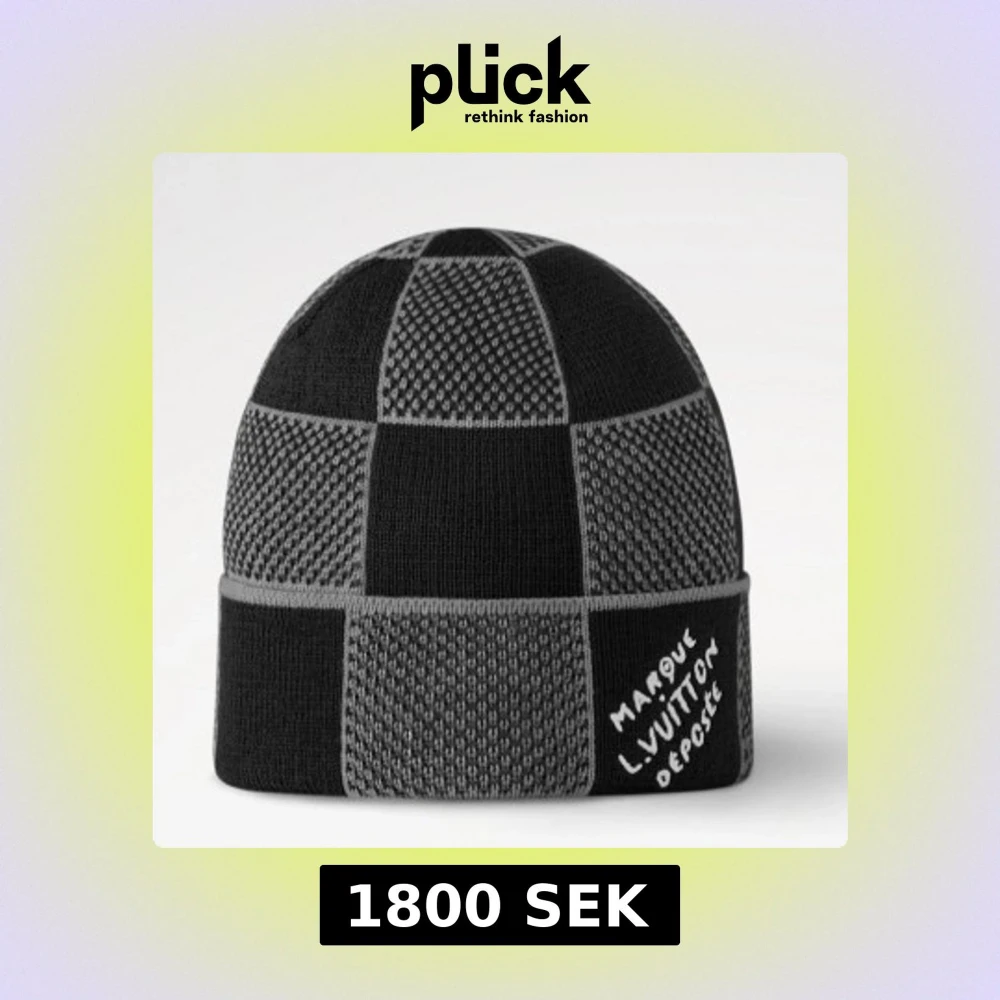 Snygg mössa från Louis Vuitton med rutigt mönster i svart och grått. Stickad design med uppvikt kant och broderad text Perfekt för dig som vill ha en cool och exklusiv look under kalla dagar. Pris kan diskuteras så tveka inte på att höra av er