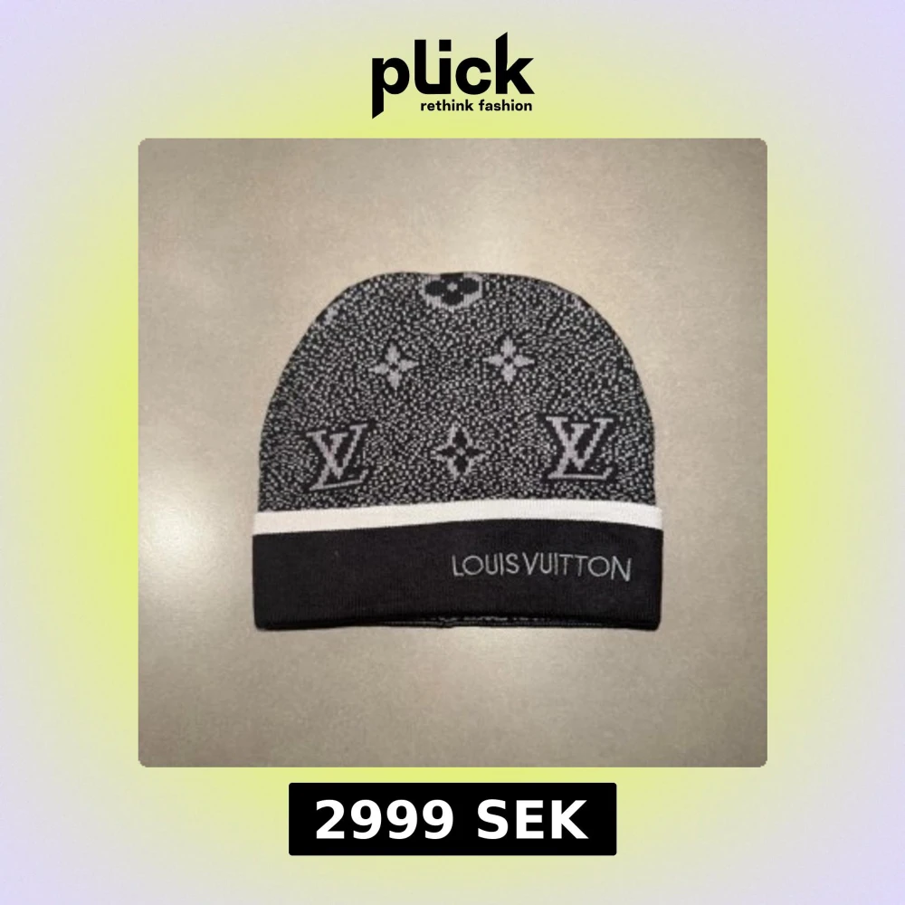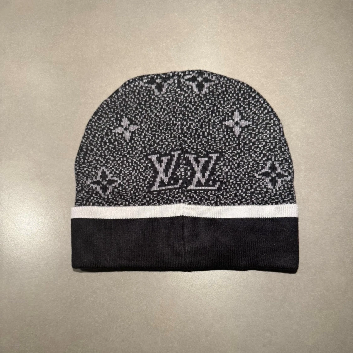 Snygg svart och grå mössa från Louis Vuitton med klassiskt LV-mönster och vit kant. Mössan är stickad och har tydlig Louis Vuitton-logga både fram och bak. Perfekt för dig som vill ha en lyxig och stilren accessoar i vinter.