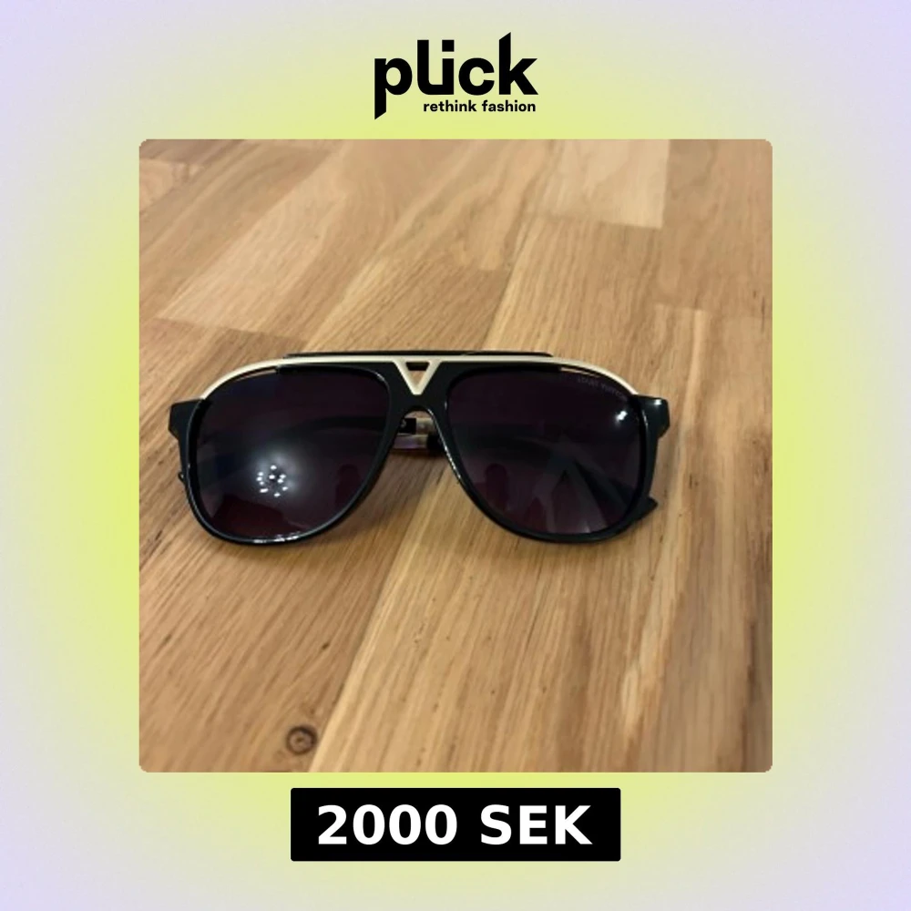 Snygga solglasögon från Louis Vuitton med svart och guldig båge i klassisk aviator-stil. Ljuslila tonade glas och diskret LV-logga på skalmarna. Metall- och plastdetaljer ger en lyxig känsla och unik design.