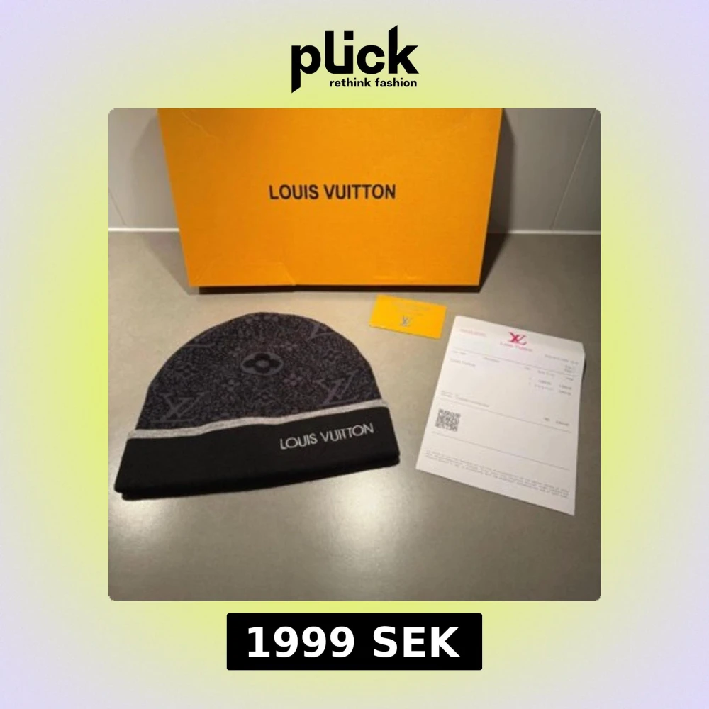 Exklusiv svart mössa från Louis Vuitton med ikoniskt monogrammönster i mörkgrått. Mössan har en bred svart kant med grå rand och broderad Louis Vuitton-logga framtill. Tillverkad i mjuk ullblandning för maximal komfort och stil.