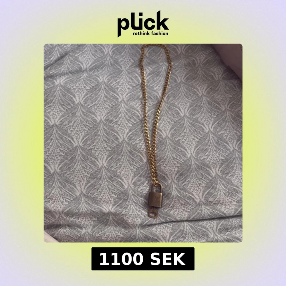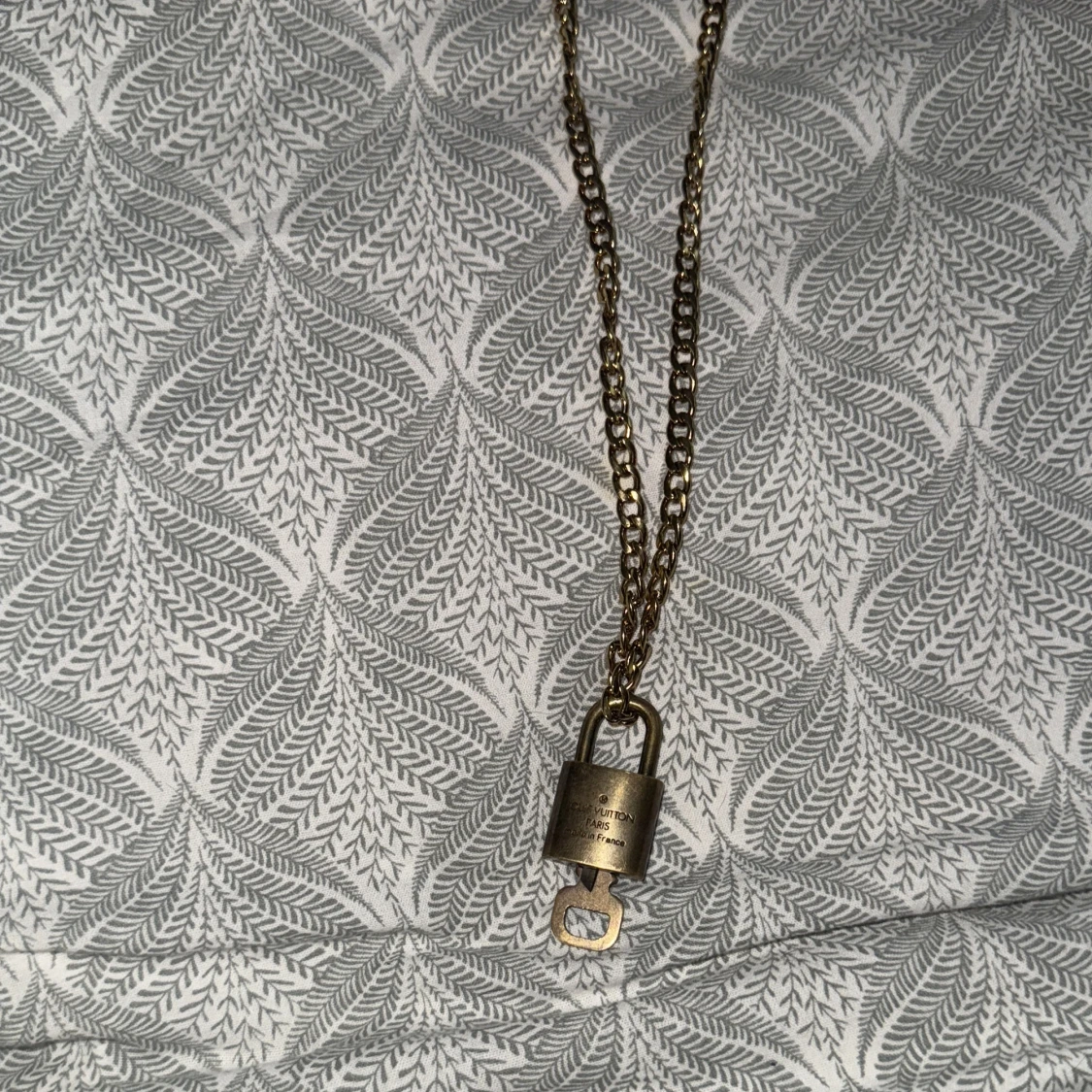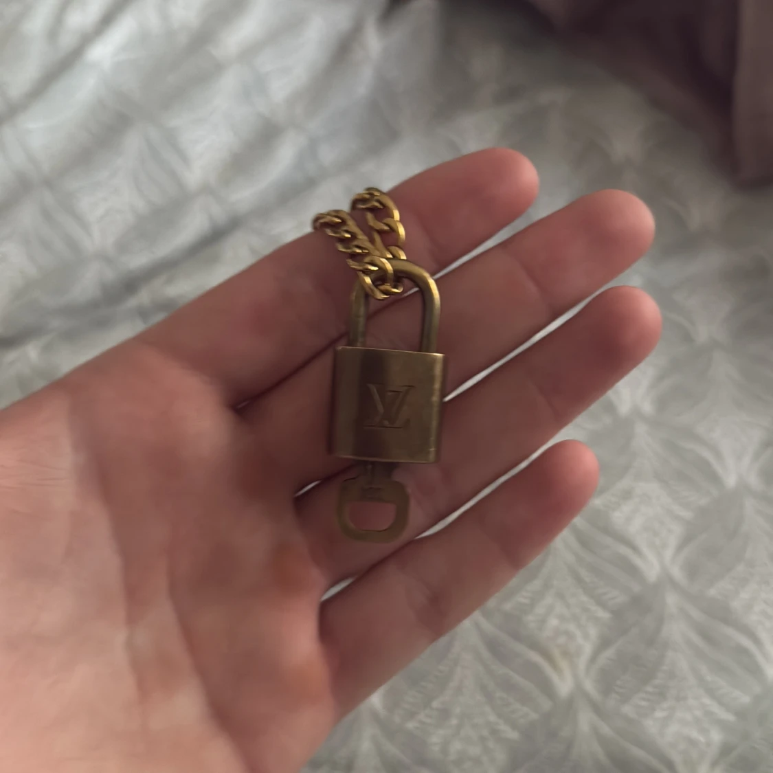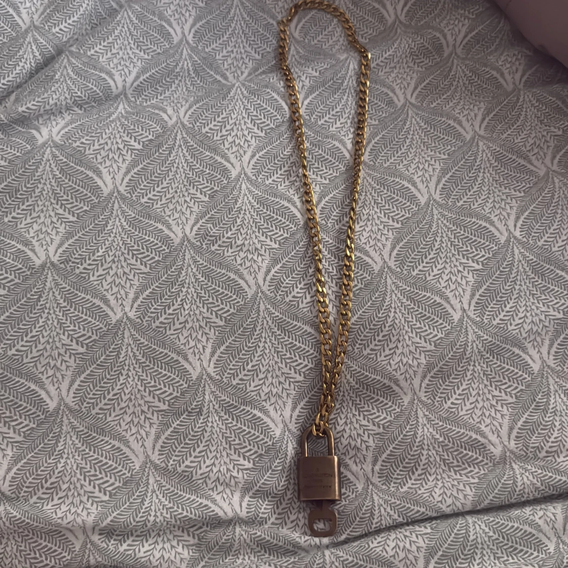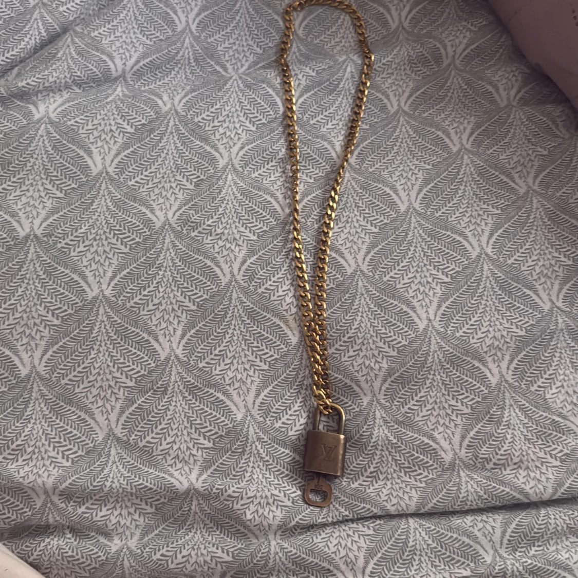 säljer Unikt halsband från Louis Vuitton med grov guldfärgad kedja och hängande lås i metall. Låset har LV-loggan på framsidan och graverad text på baksidan.