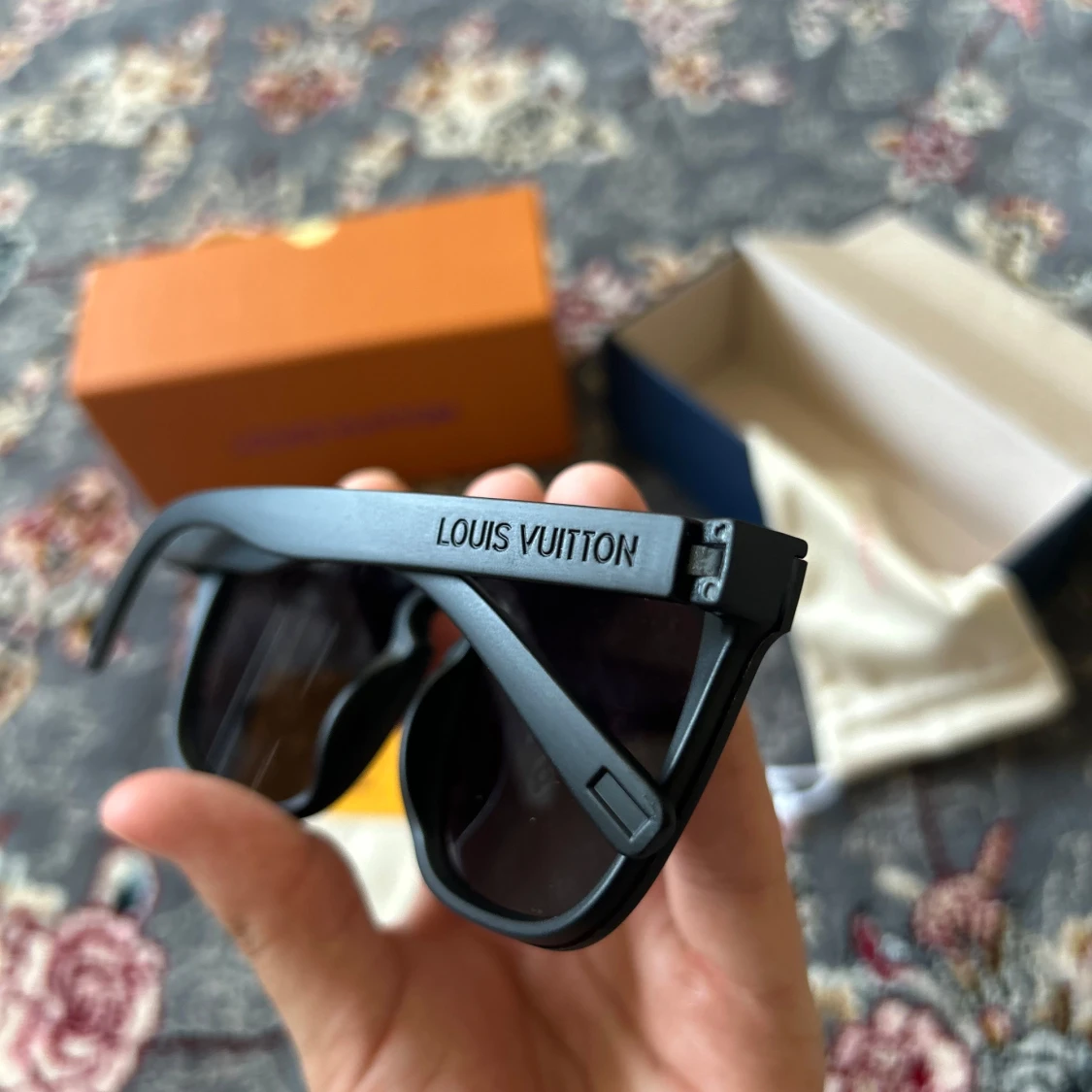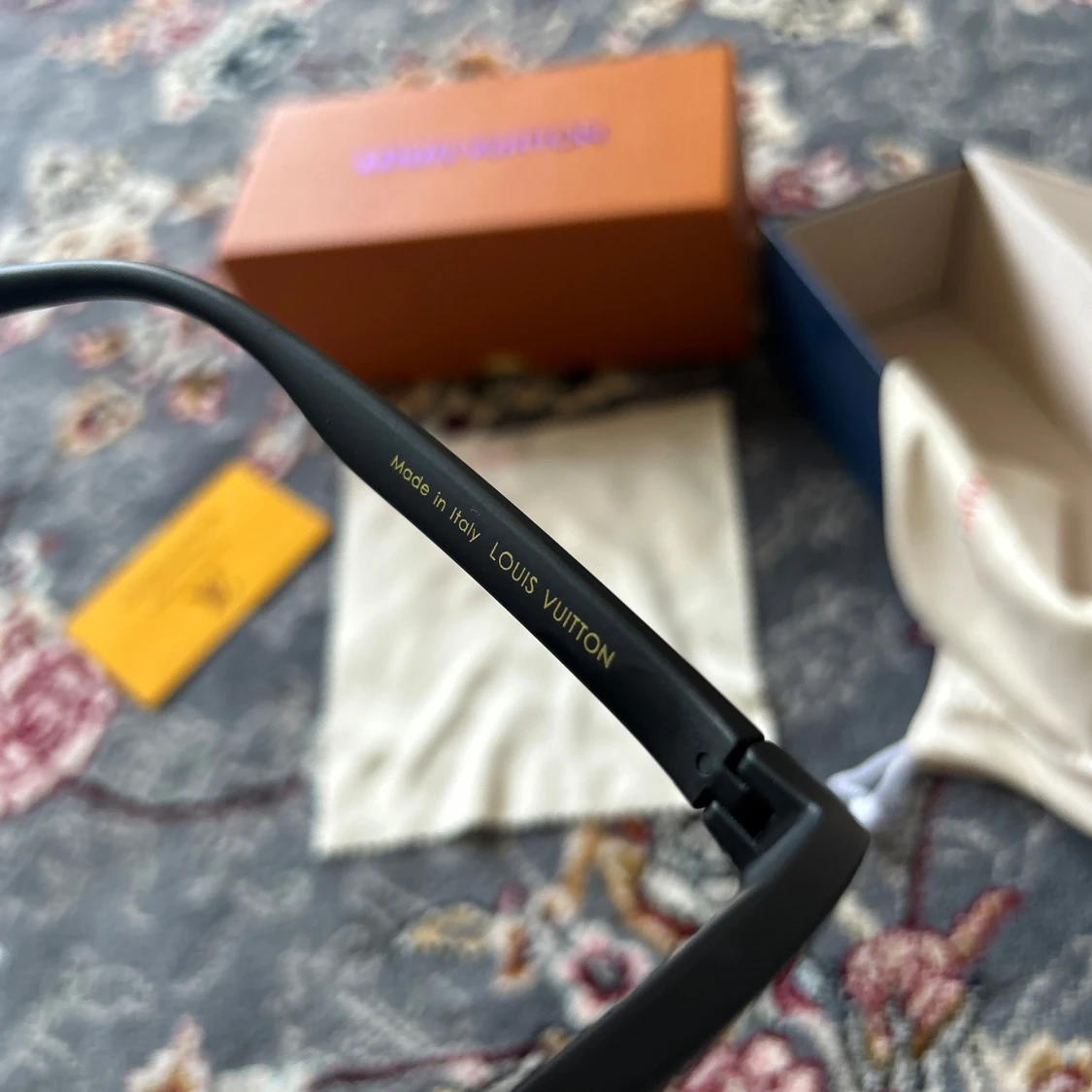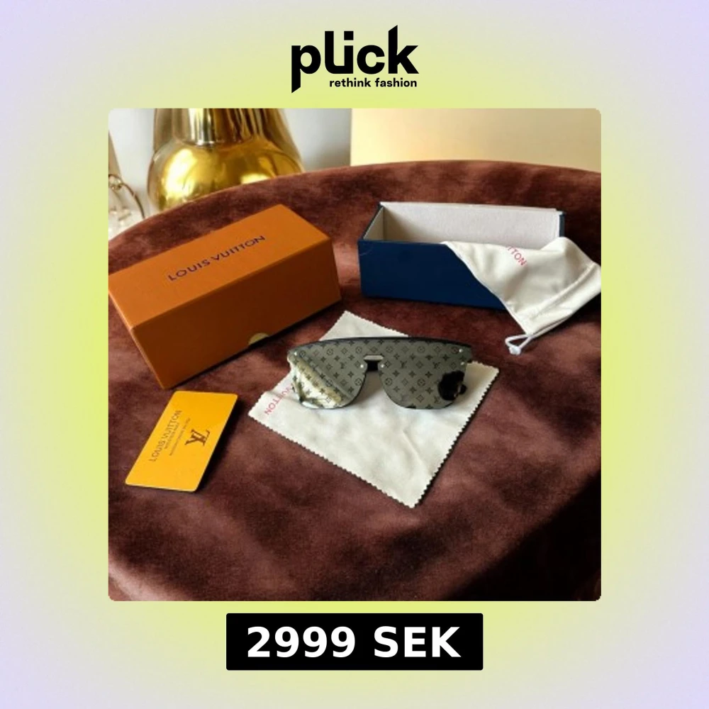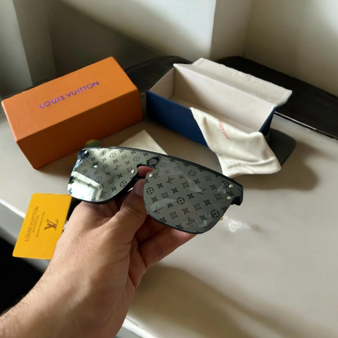 Snygga svarta solglasögon från Louis Vuitton med spegelglas och ikoniskt LV-monogram över hela linsen. Modellen har en futuristisk shield-form och mattsvarta bågar med Louis Vuitton-logga på sidan. Perfekt accessoar för dig som vill sticka ut.
