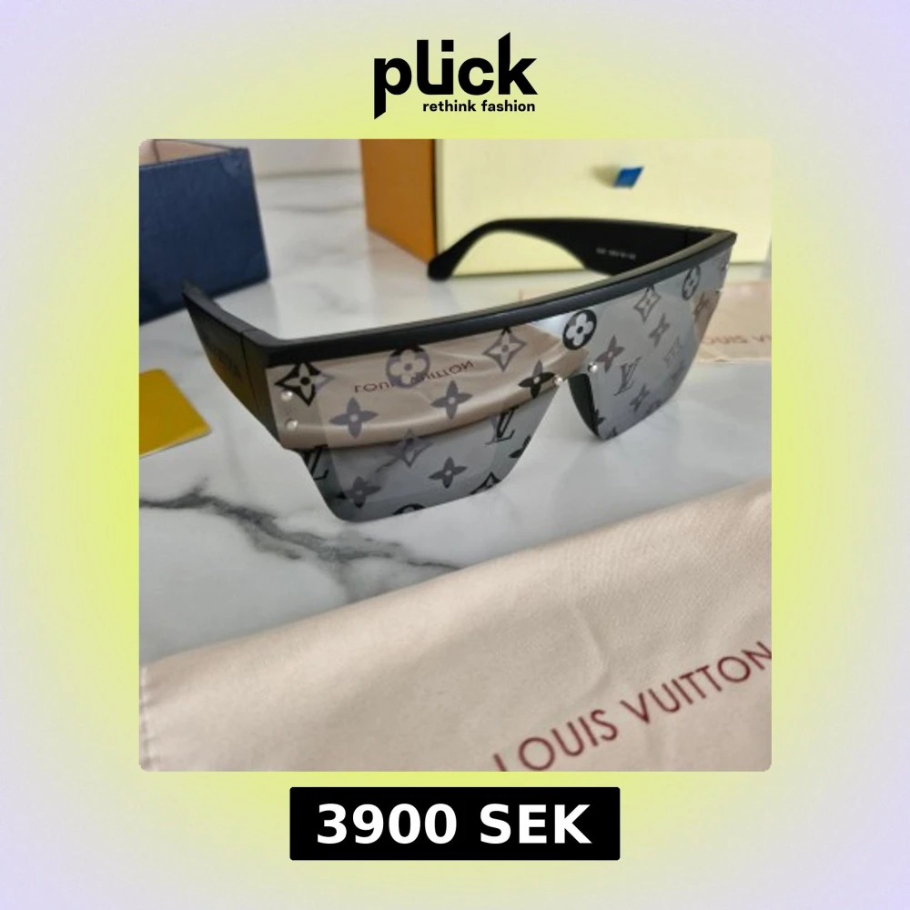 Säljer ett par svarta shield-glasögon från Louis Vuitton med breda skalmar och LV-monogram över hela linsen. Glasögonen har en futuristisk, kantig form och är tillverkade i syntetmaterial. Kommer med originalfodral, ask och certifikat.