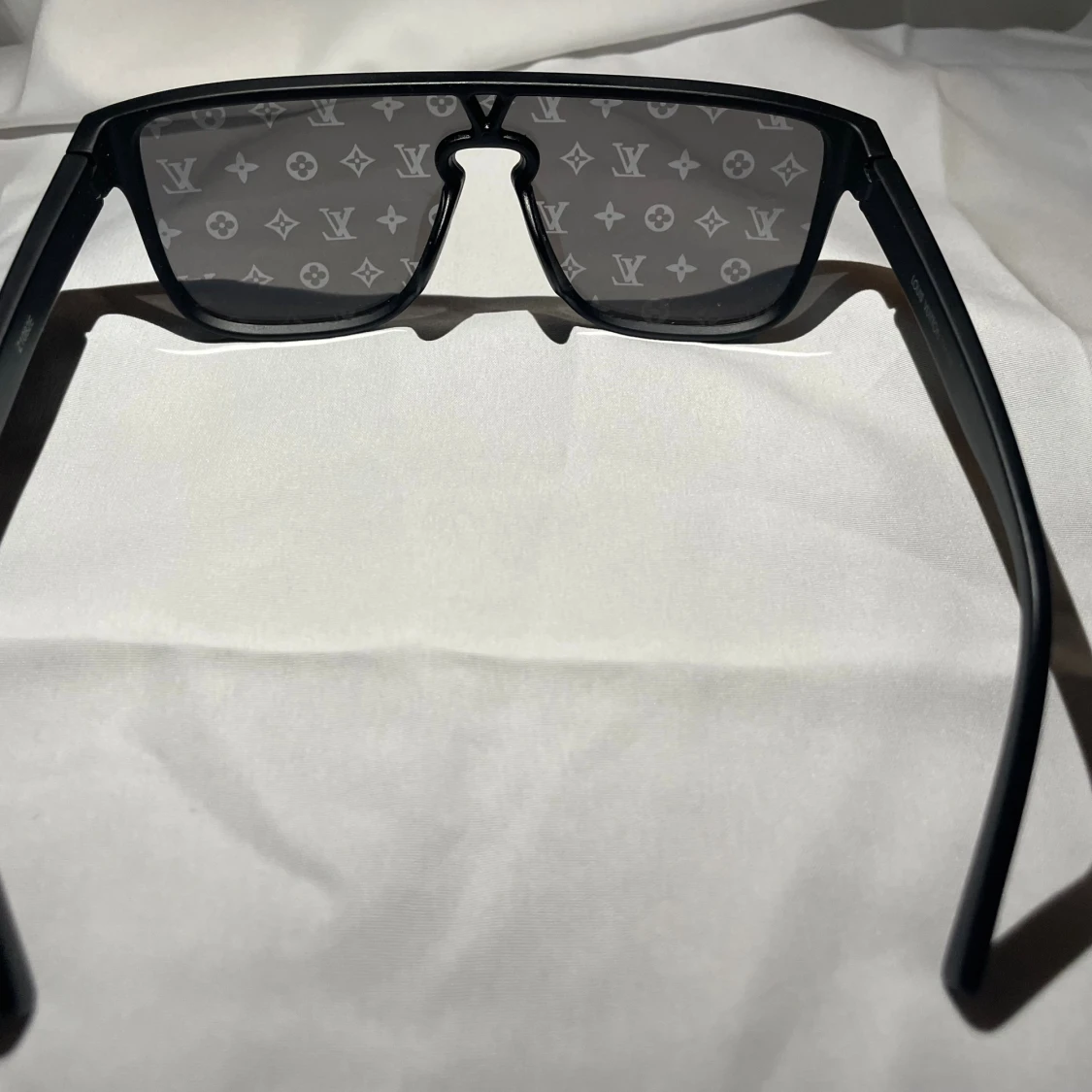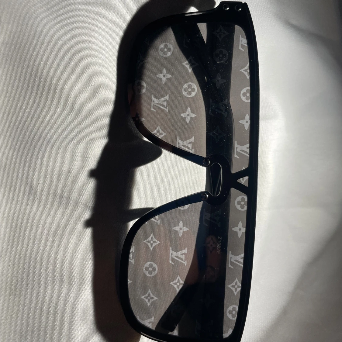 Snygga svarta solglasögon från Louis Vuitton med bred båge och rektangulär form. Glasen har det ikoniska LV-monogrammet tryckt över hela ytan för en riktigt lyxig vibe. Perfekta för dig som vill sticka ut och visa stil.