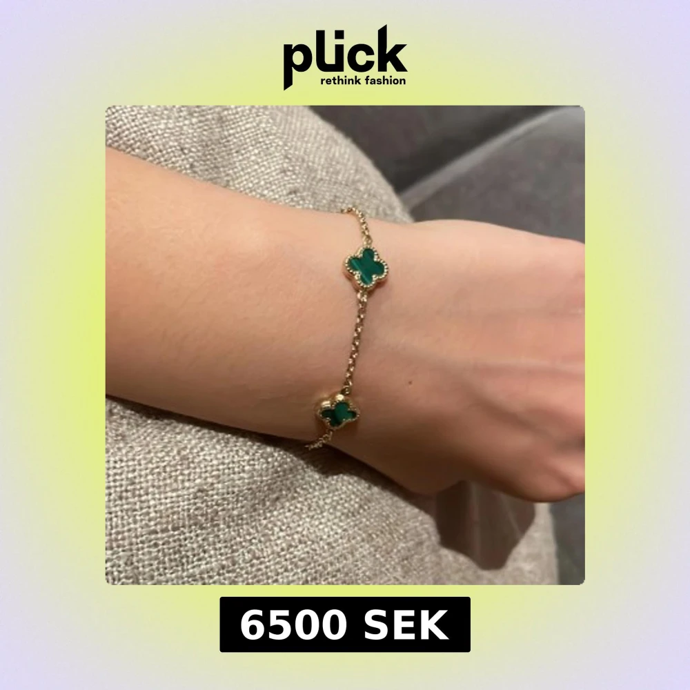Elegant armband med fem gröna fyrklöver i guldinfattning, inspirerat av Alhambra-designen. Tunn guldfärgad kedja. Armbandet är 14k guld och knappt använd.
