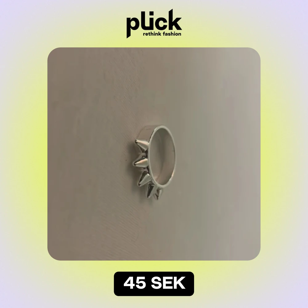 Detta är en silvrig ring med små nitar på. Det är ätervunnin metall. Den är i bra skick, har aldrig använt den.