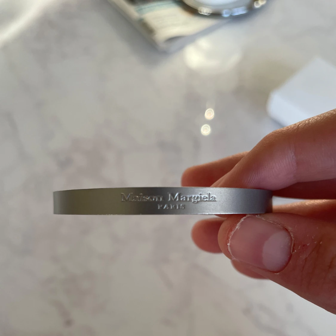 Säljer nu detta feta armbandet från Maison margiela, det är i sjukt bra skick skulle säga 9/10, armbandet är onesize då det är böjbart, släpper för endast 699 men priset kan diskuteras ytterligare litegrann🤝 Allt gott, mvh Noah