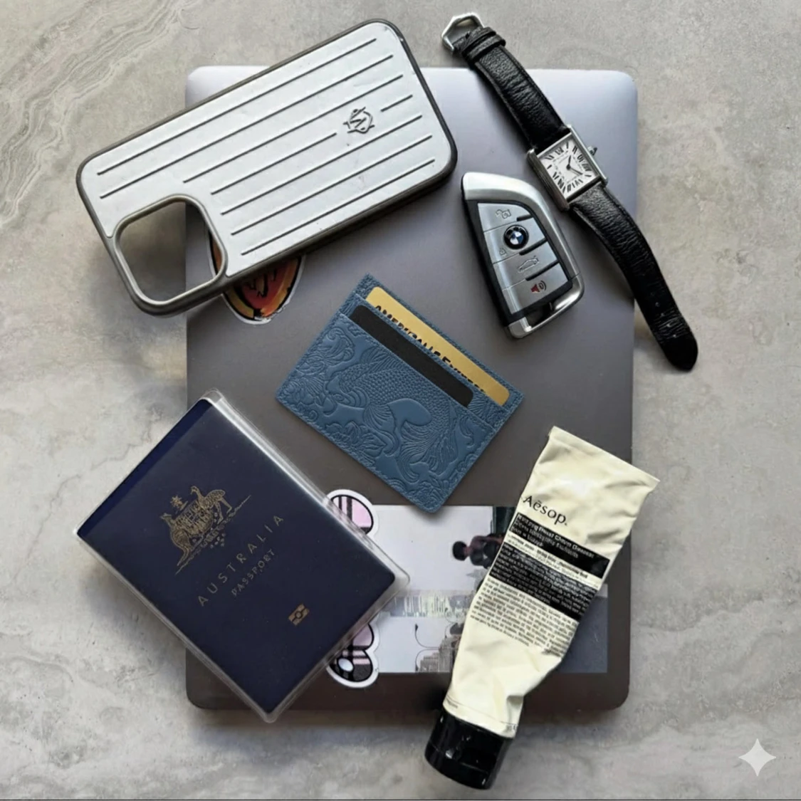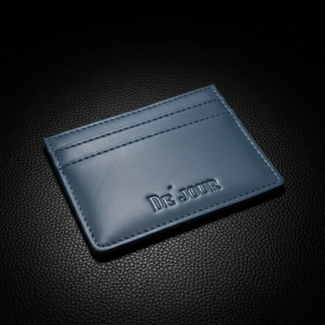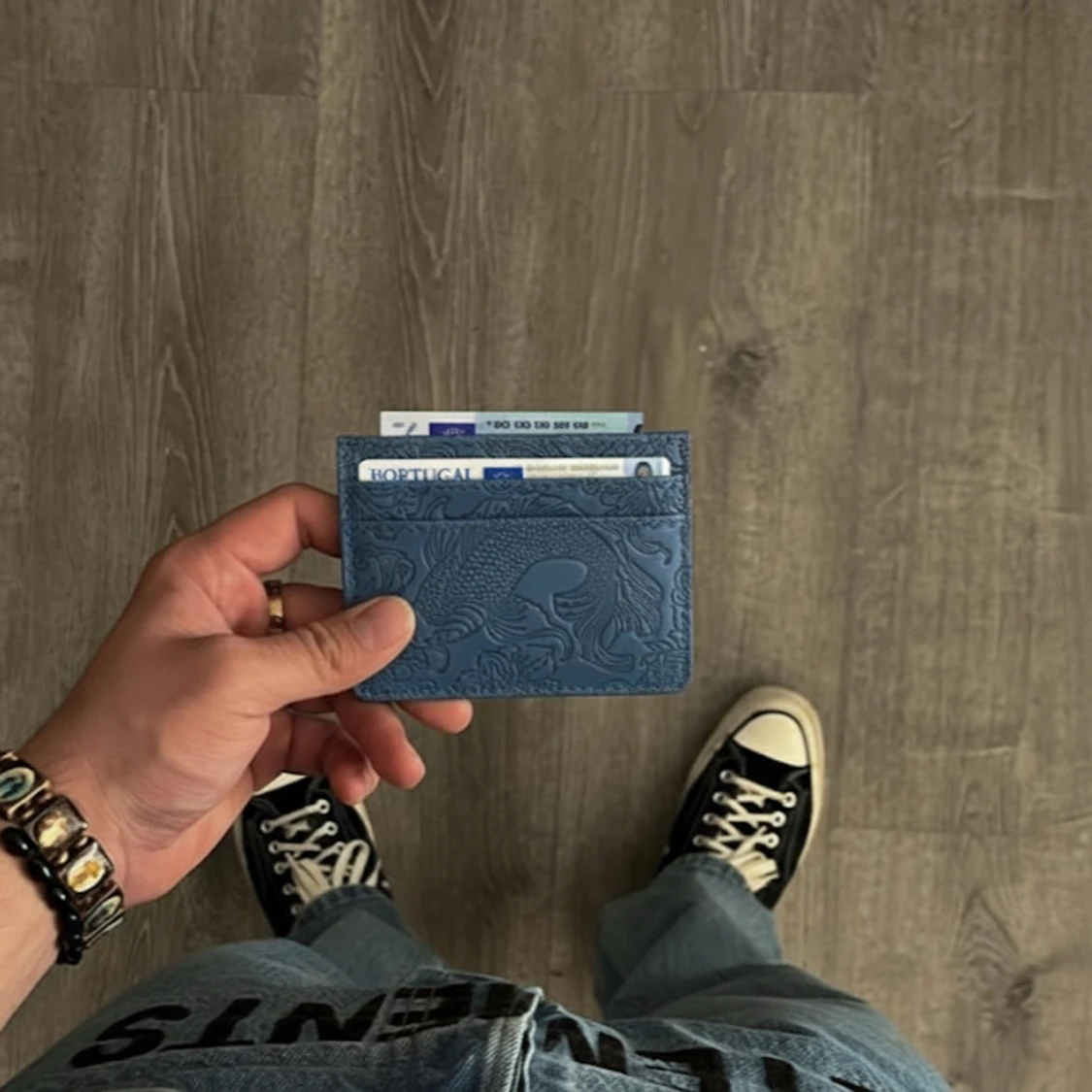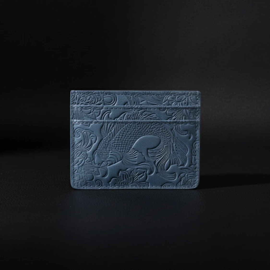 Elegant blå korthållare i läder från De’Jour med vackert koimönster. Flera kortfack, kompakt design och stilren finish. Perfekt för att organisera kort och sedlar. Nyskick