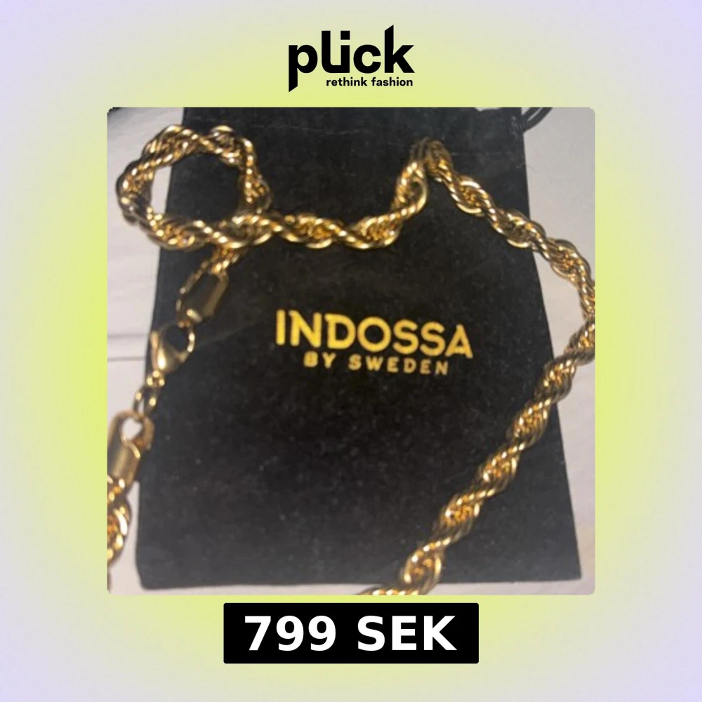 Snyggt guldfärgat halsband från Indossa by Sweden med tvinnad kedja. Priset kan diskuteras. Kommer med svart förvaringspåse med Indossa-logga.
