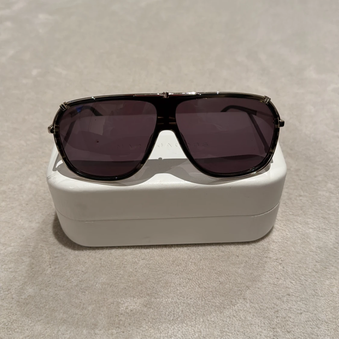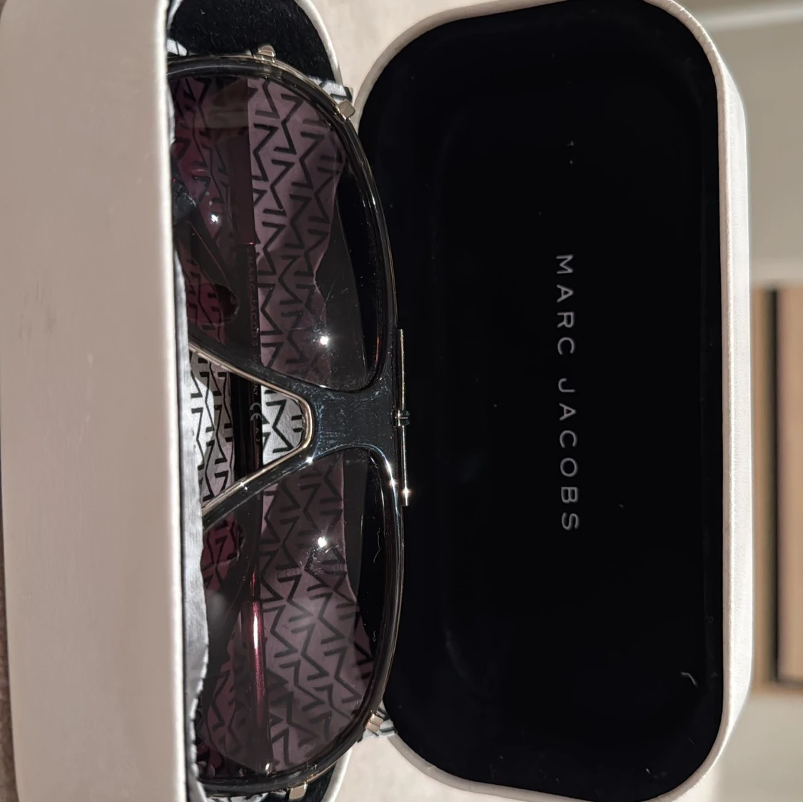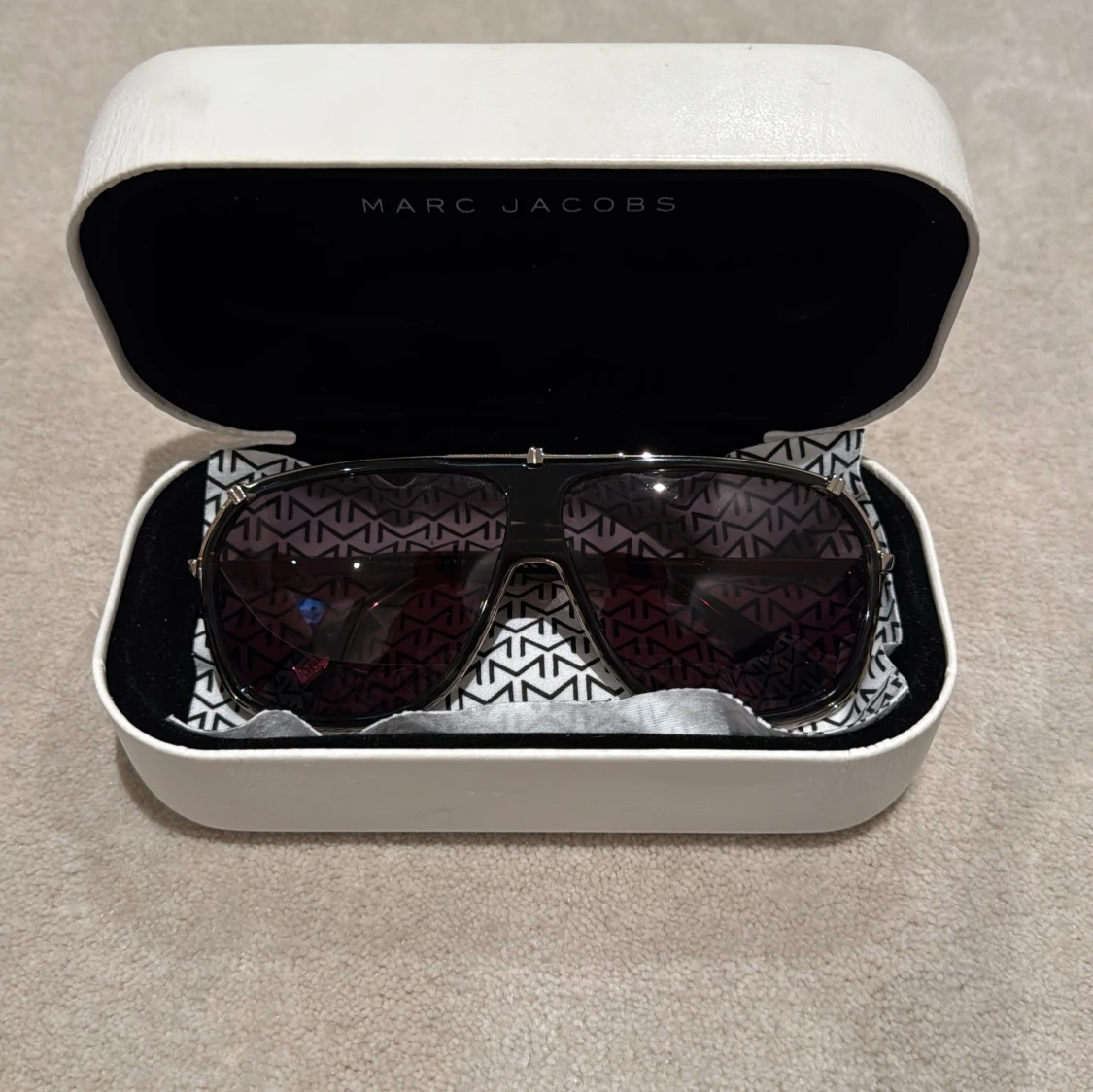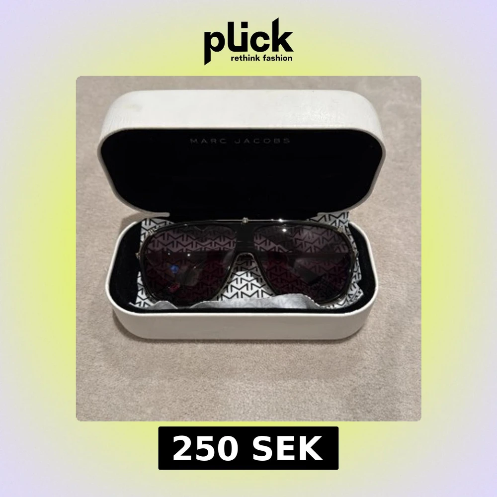 Snygga solglasögon från Marc Jacobs med pilotformade bågar i silverfärgad metall och mörka linser. Klassisk och stilren design med diskret logga på skalmen. Kommer med originaletui.
