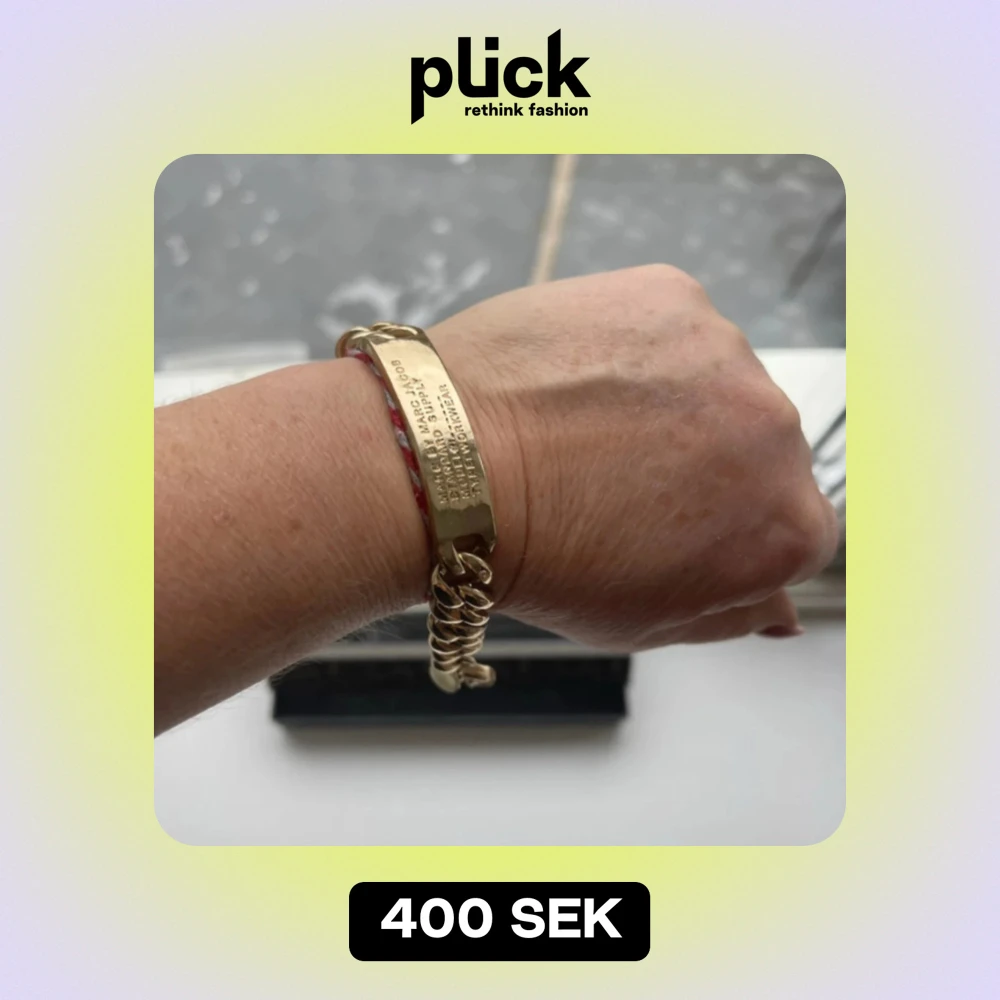 Snyggt guldarmband från Marc by Marc Jacobs med en stilren design. Armbandet har en platta med ingraverad text och en robust kedja. Perfekt för att ge en touch av lyx till din outfit. Låset är enkelt att använda och det finns en liten rund detalj med märkets namn.