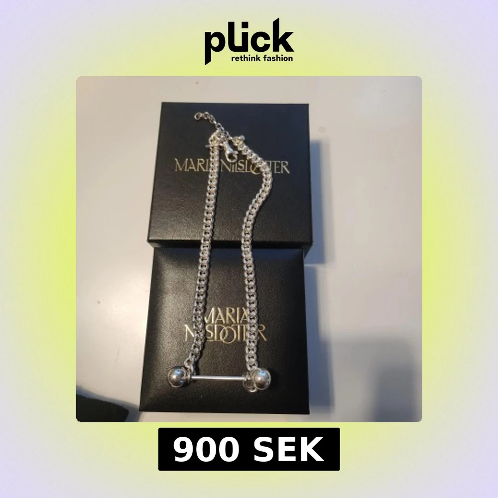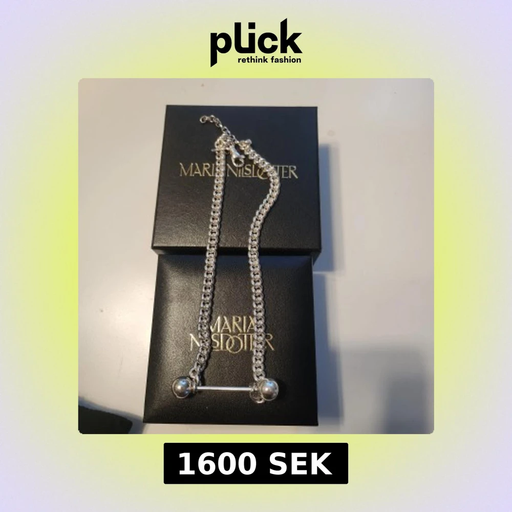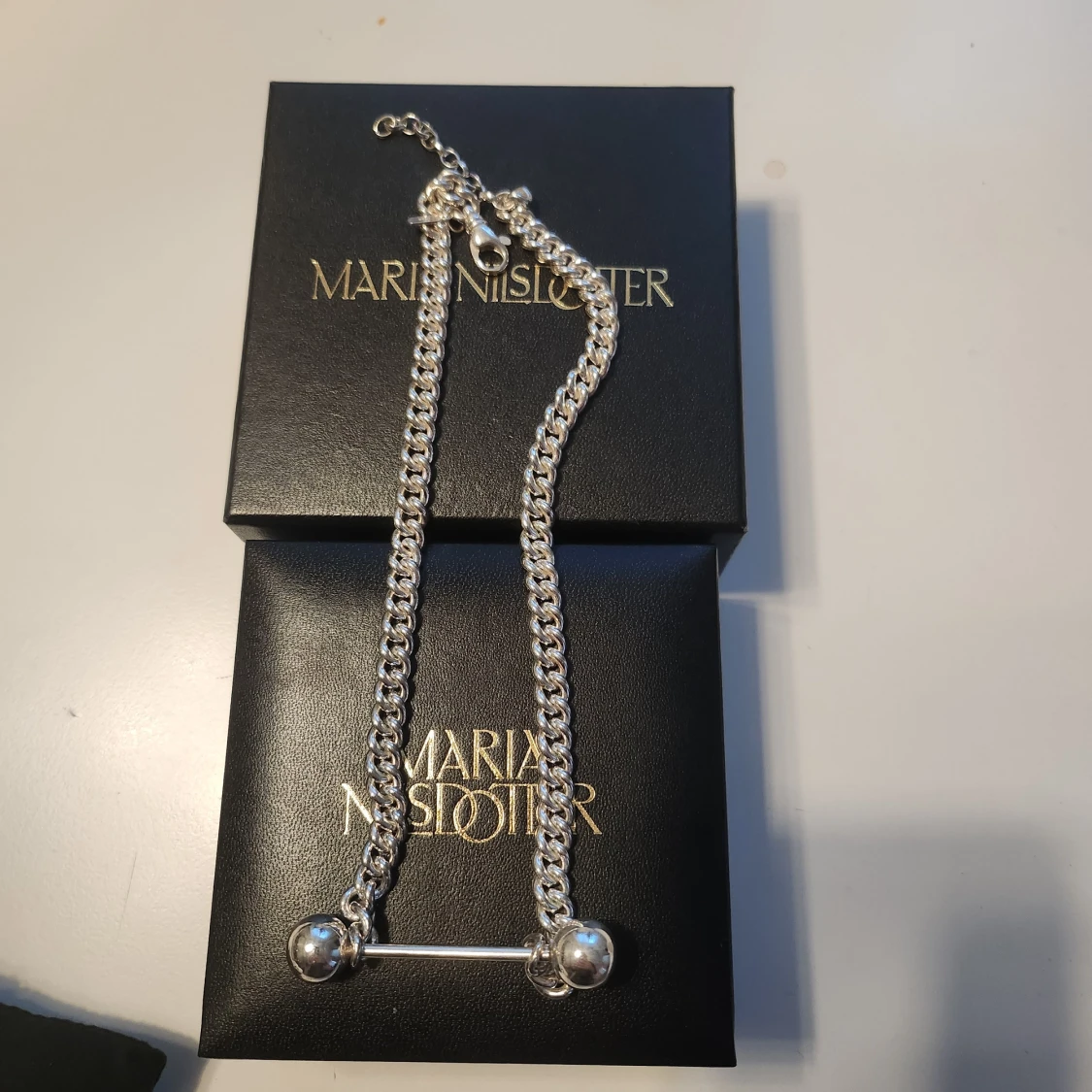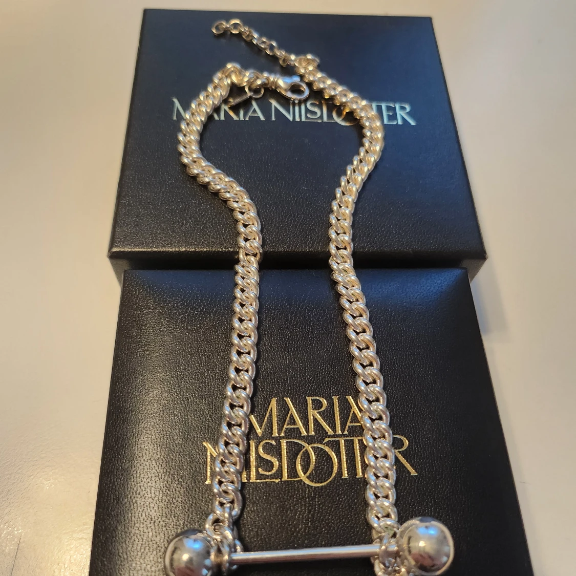 Snyggt silverarmband från Maria Nilsdotter med grov kedja och cool detalj med en stav och två klot i ändarna. Halsband har justerbar längd och kommer i original ask med guldfärgad ormtryck. Perfekt för dig som gillar statement-smycken med edge.