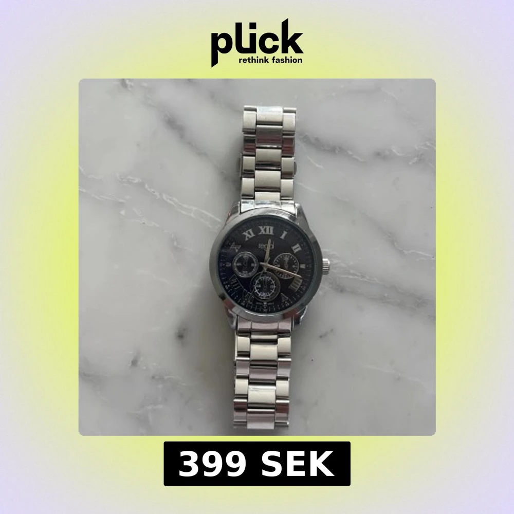 Stilren klocka från Regal med silverfärgad länk i metall och svart urtavla. Urtavlan har romerska siffror och tre mindre dekorativa subdials. Klassisk design som passar till många olika stilar. Metallarmbandet har en smidig låsmekanism.