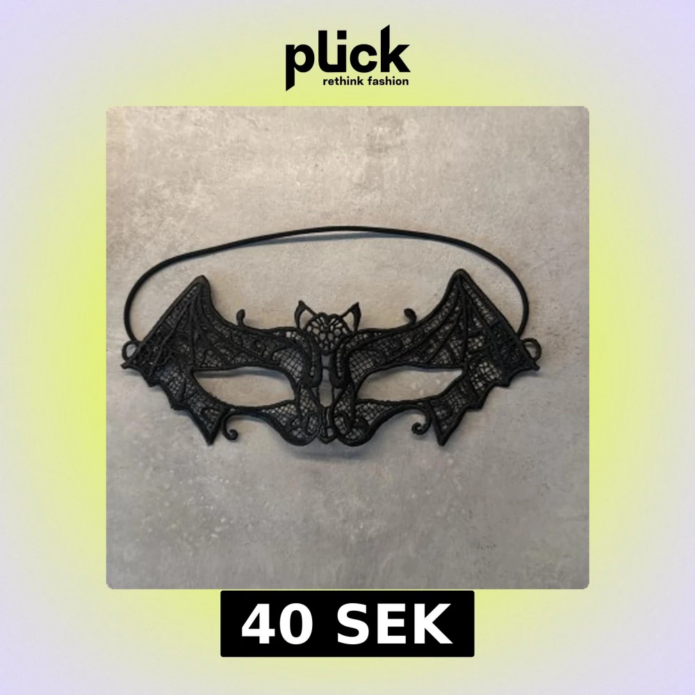 Elegant svart mask i spets med fladdermusdesign, perfekt för maskerad eller fest. Masken har detaljerade spetsmönster och hålls på plats med ett elastiskt band.