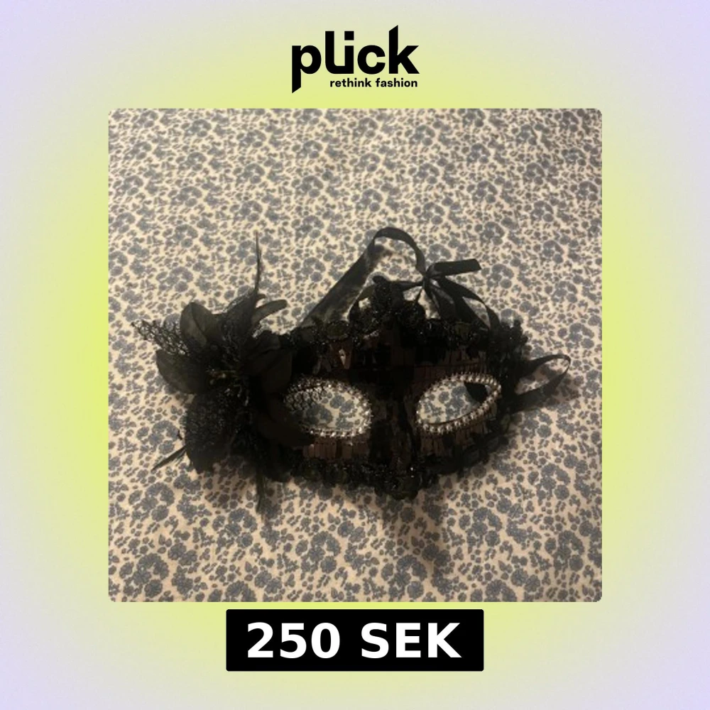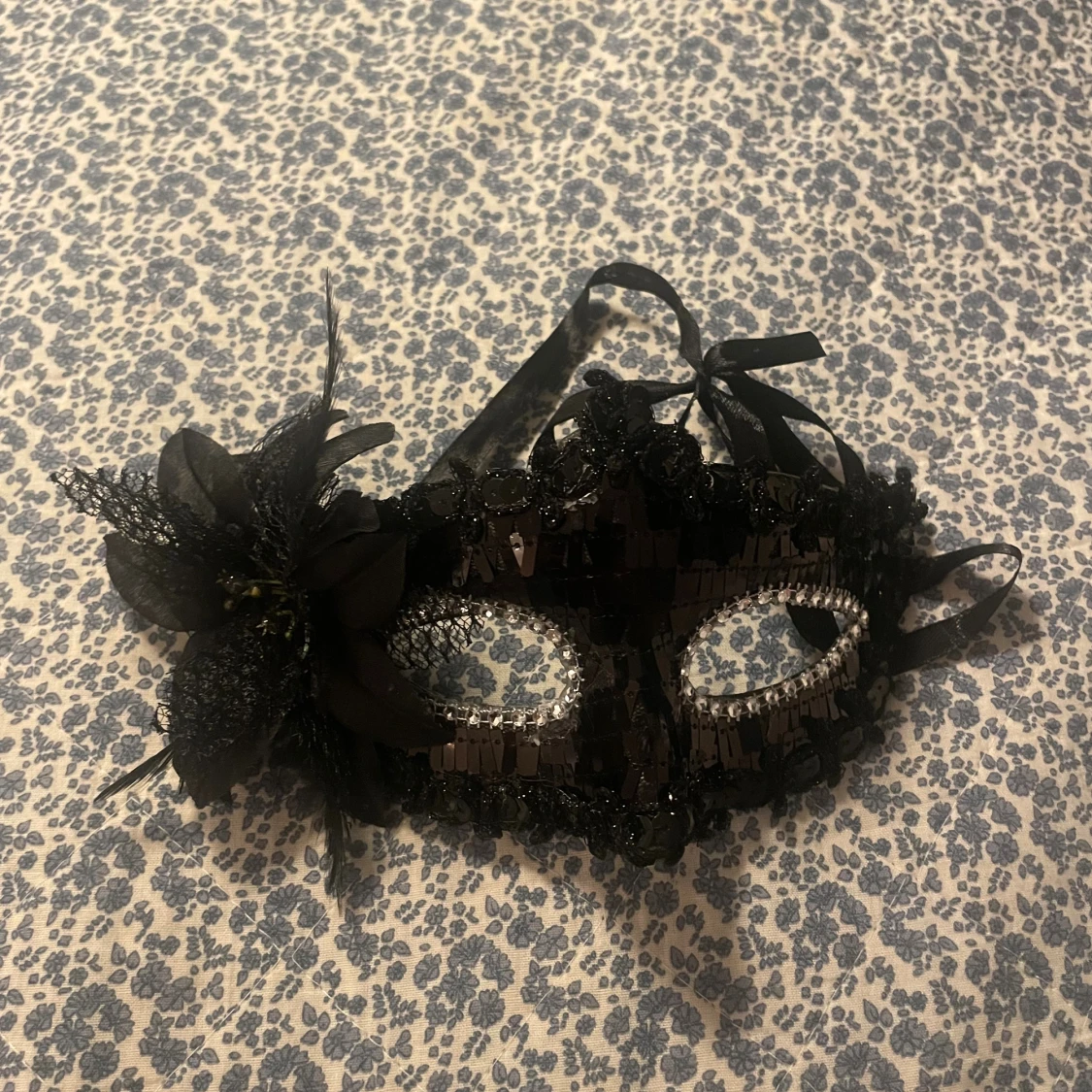 Snygg svart maskeradmask med svarta paljetter på ytan och en fin spets blomma på sidan 💕Den har knytband för att fästa runt huvudet. Perfekt för bal eller fest! Jag hade den på en halloween fest och fick många komplimanger 😊