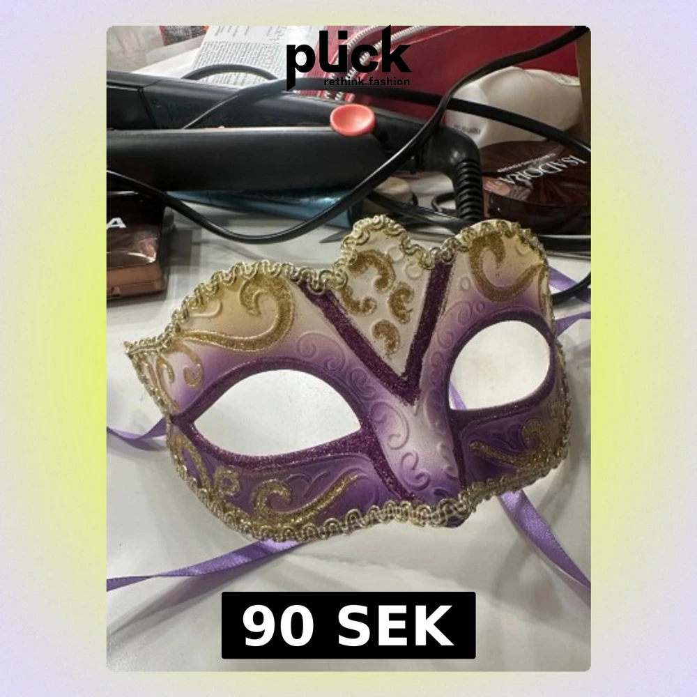 Säljer en snygg maskeradmask i lila och vitt med glittriga detaljer i guld. Masken har vackra snirkliga mönster och en dekorativ kant i guld. Knyts med lila band bakom huvudet och passar perfekt till temafest eller bal.