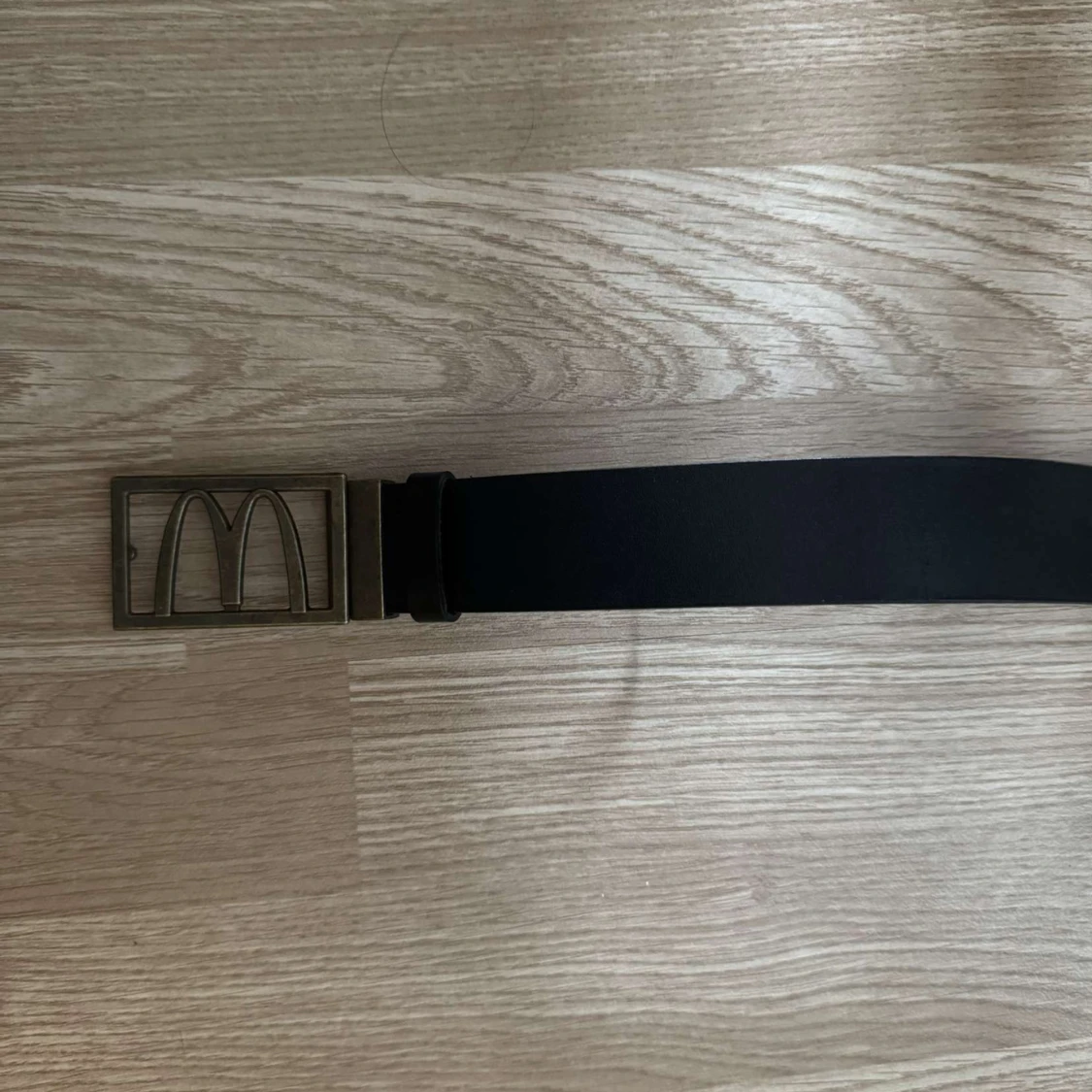Säljer ett svart bälte med ett stort, fyrkantigt metallspänne som har en unik design. Bältet är stilrent, och 140cm långt men går att kapa och göra nya hål