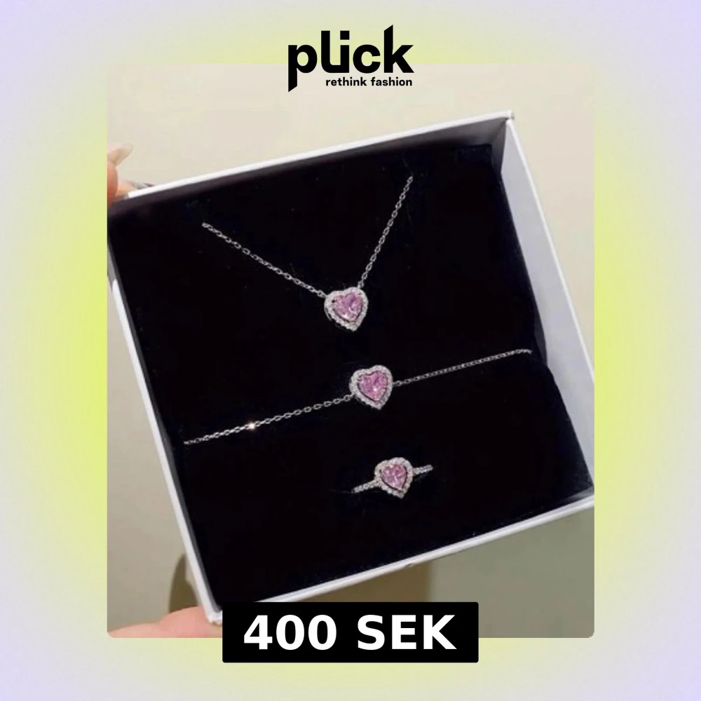 Snyggt smyckeset med halsband, armband och ring i silverfärg. Alla delar har ett hjärtformat hänge med rosa stenar omgivna av glittrande vita stenar. Perfekt för dig som gillar söta detaljer och vill sticka ut lite extra.