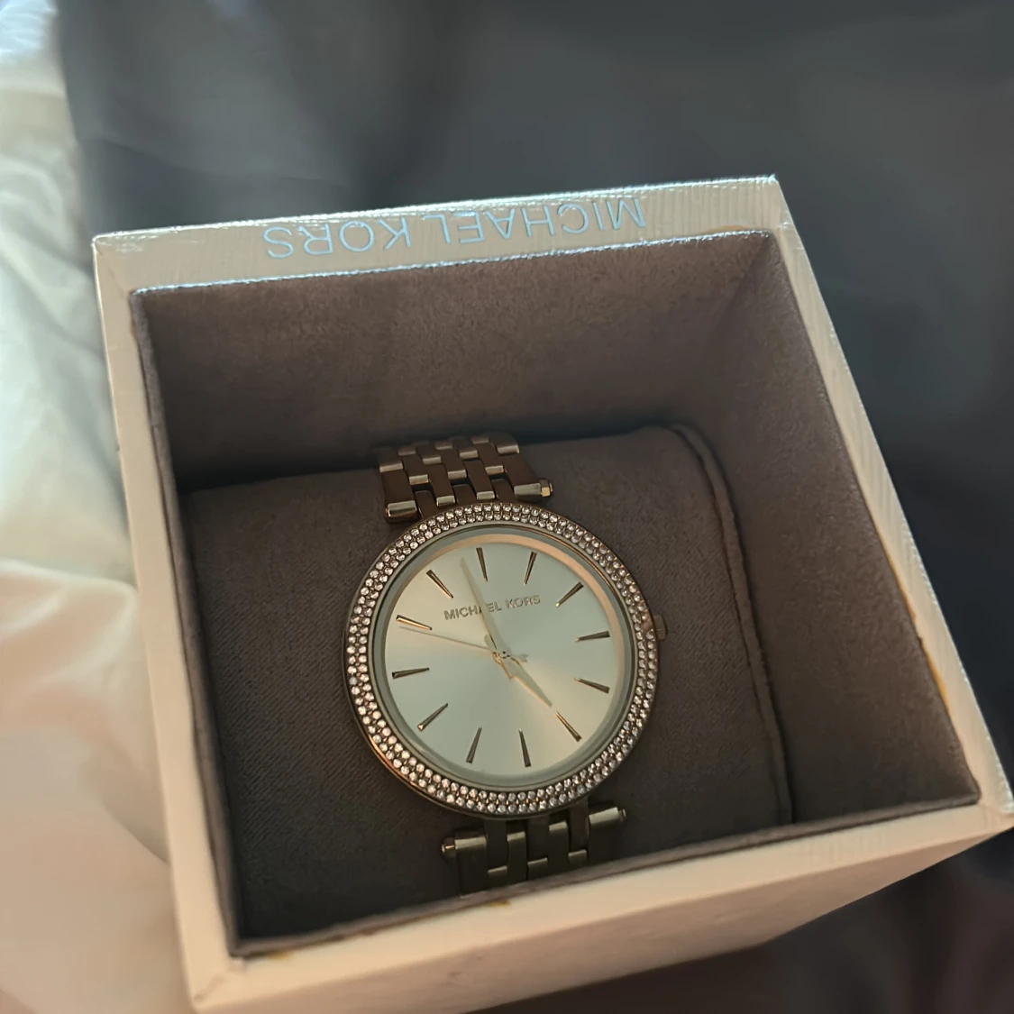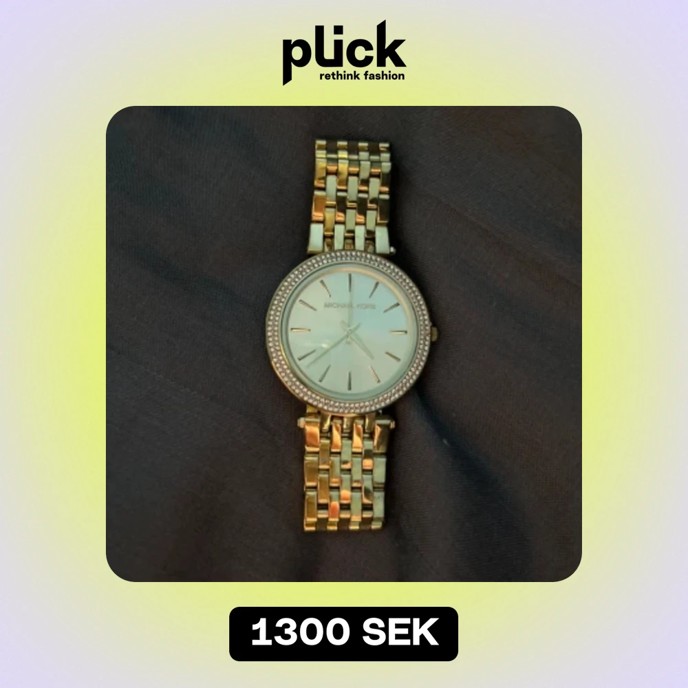 En Michael kors klocka , använd ett par ggr bara! En plupp har dock lossnat som håller ihop den men de kan man nog fixa snabbt! Inga repor. Boxen är lite skadad vilket du ser på bilden…