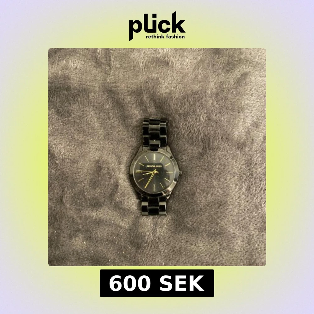 Stilren svart klocka från Michael Kors med metallarmband och svart urtavla. Urtavlan har tunna guldiga visare och markeringar, vilket ger en snygg kontrast. Länken är robust och har Michael Kors-logga på spännet. Perfekt accessoar för att lyfta din outfit.
