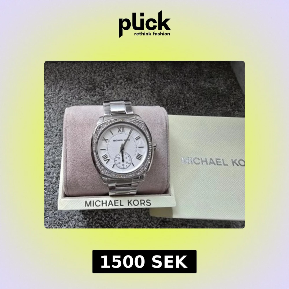 Stilren Michael Kors-klocka i silver med metallänk och glittrande stenar runt boetten. Vit urtavla med romerska siffror och liten sekundvisare. Klockan är helt ny och oanvänd med skyddsplast kvar och levereras i originalask med kudde och manual. En elegant accessoar som passar alla tillfällen.