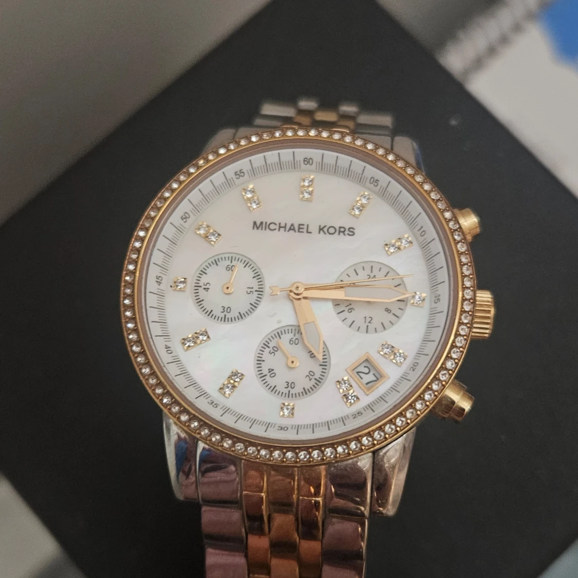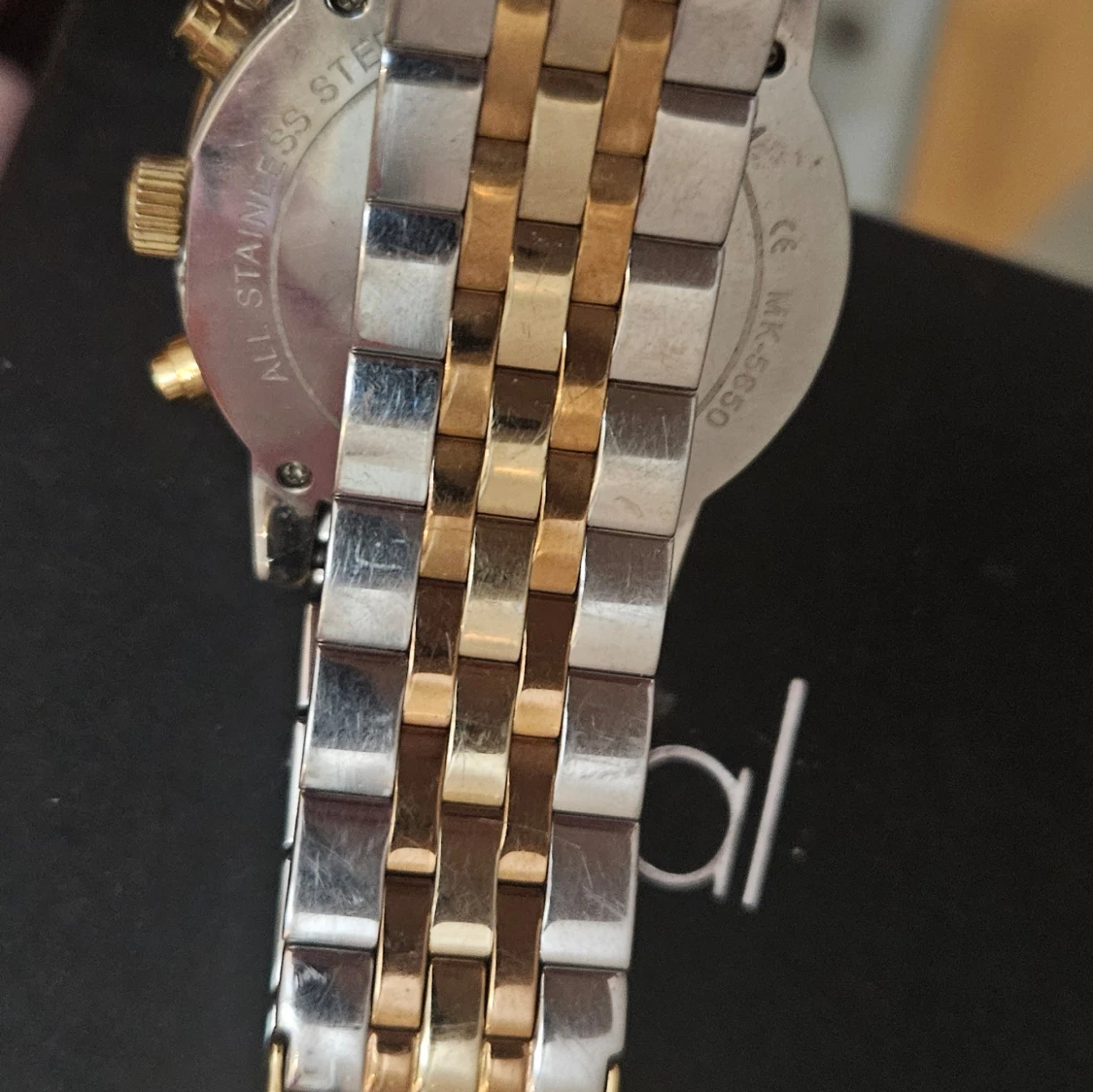 Elegant Michael Kors klocka med en skimrande urtavla prydd med glittriga stenar. Klockan har en tvåfärgad länkarmband i guld och silver samt en datumvisare. Perfekt för att ge en lyxig touch till din stil.