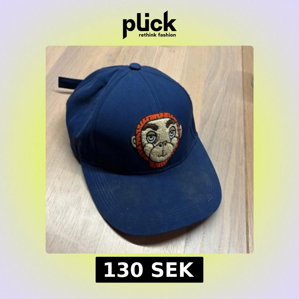 Mini Rodini keps med justerbar rem och broderad apa framtill i orange och beige. Klassisk form med böjd skärm och ventilerande hål. Fint skick men behöver tvättas stl 52/54