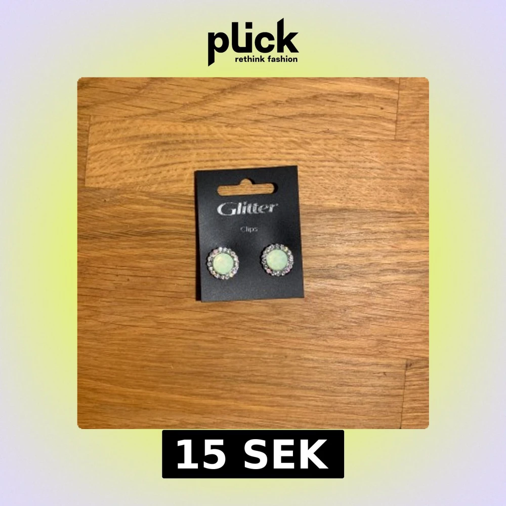 Runda clipsörhängen med mintgrön sten i mitten, omgiven av små gnistrande stenar i silverfärg. Klassisk och söt design som ger en glittrig touch till din look. Perfekta för dig som vill ha örhängen utan hål. Ena örhängets gummi har hårdnat men funkar lika bra