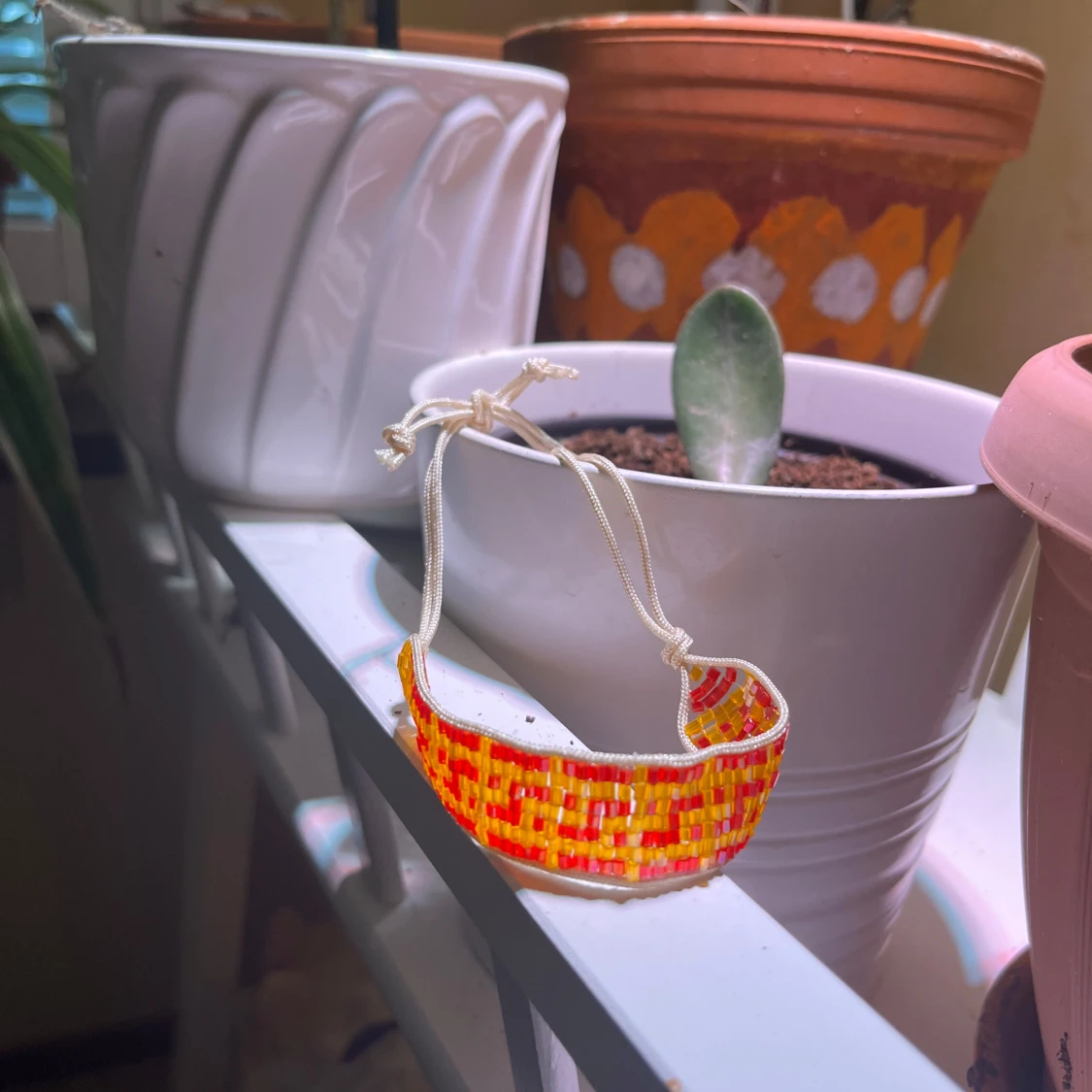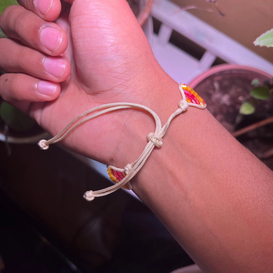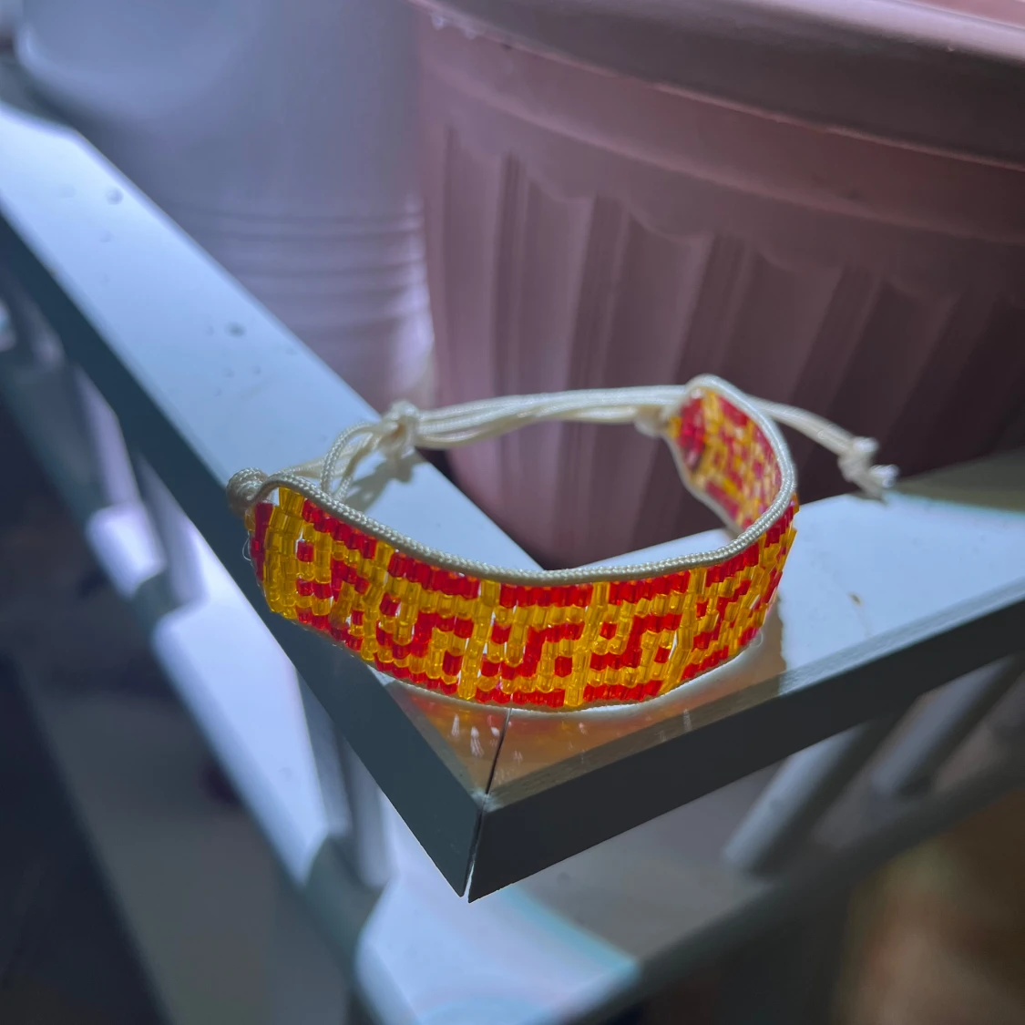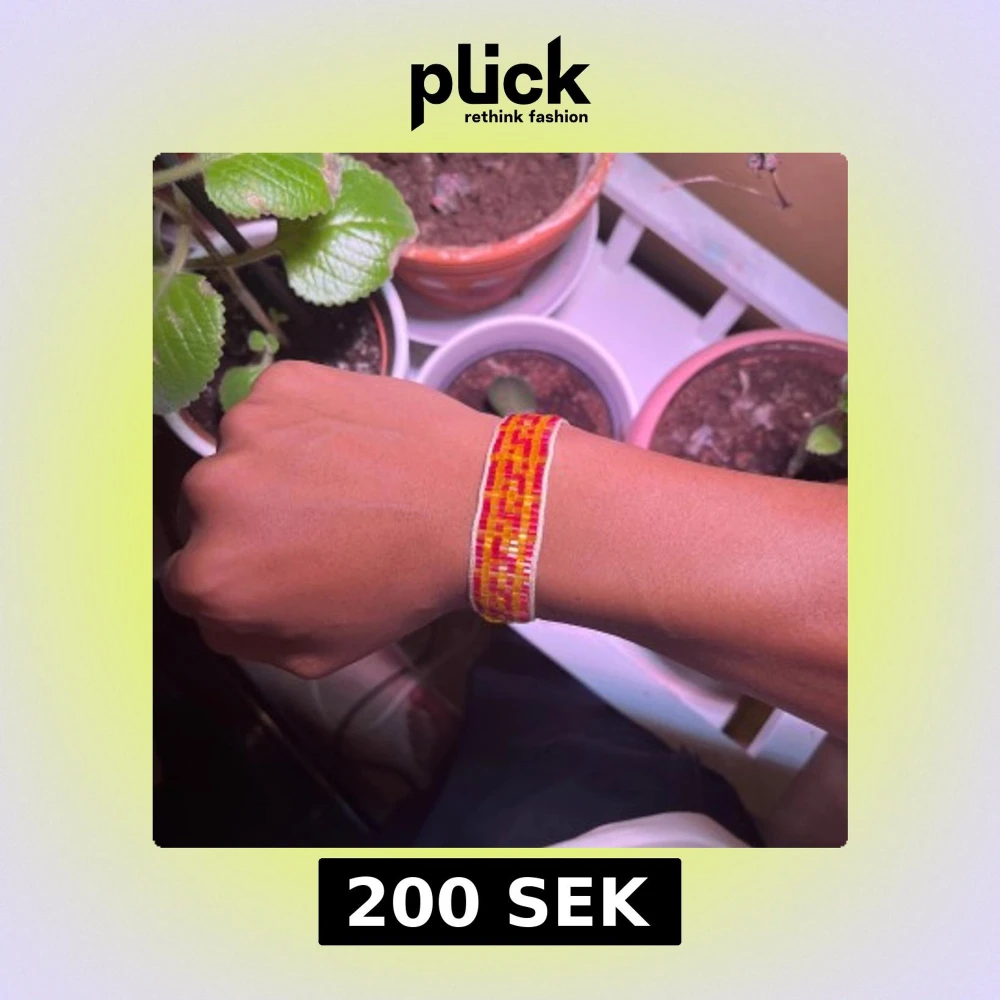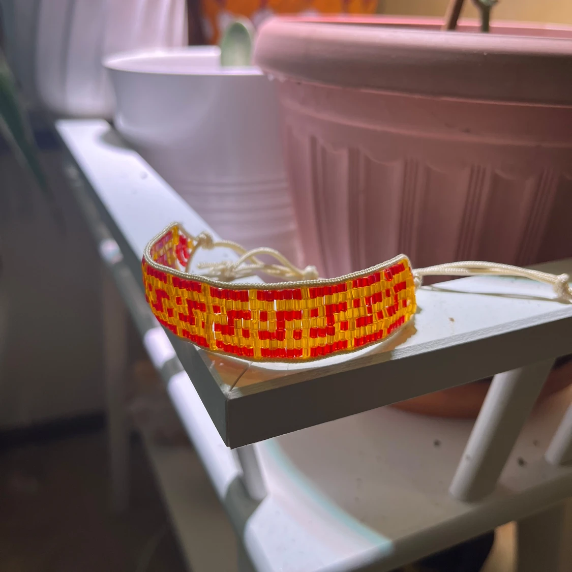 Unikt hem gjord armband med pärlor i rött, gult i ett geometriskt mönster. Armbandet har en beige justerbar knytning som gör det enkelt att anpassa storleken. Perfekt accessoar för att liva upp din stil!