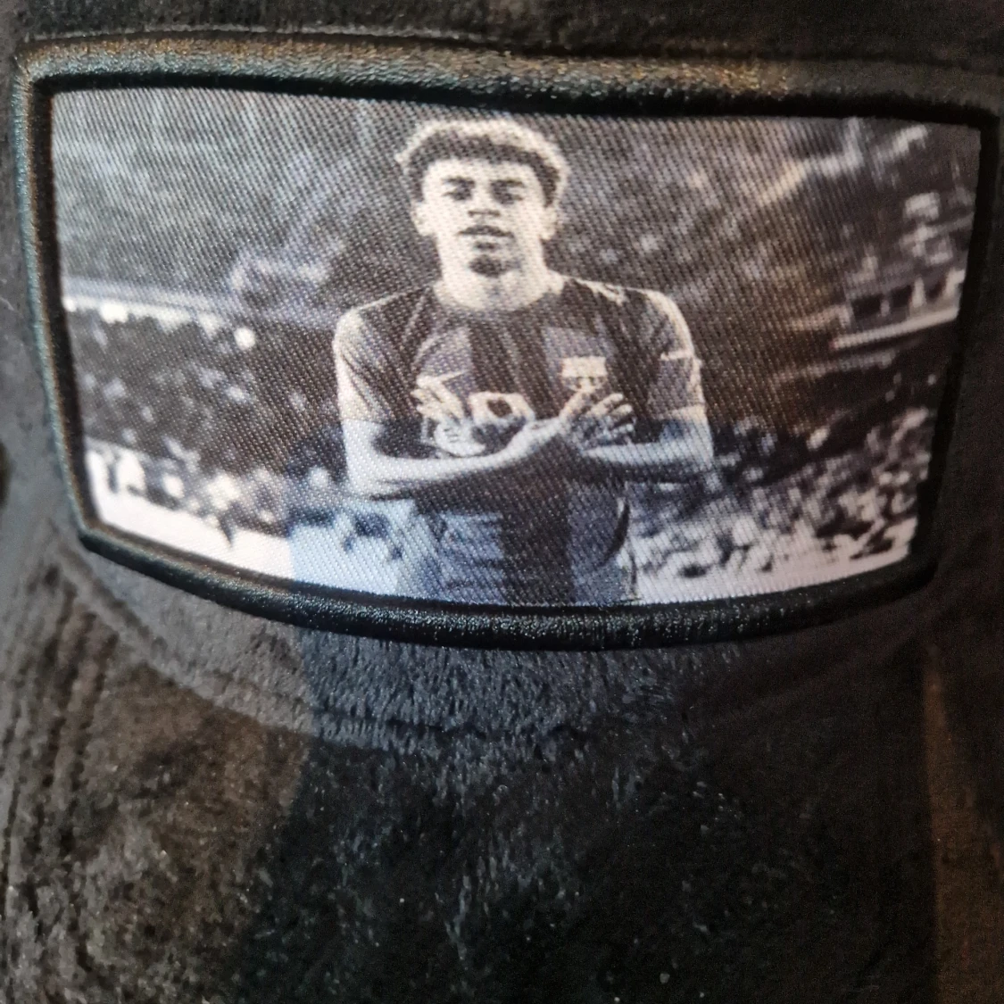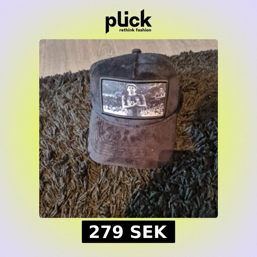 Svart keps från Evosportswear med mjuk yta och ett stort svartvitt tryck framtill av en fotbollsspelare på arenan. Kepsen har böjd skärm och mesh på insidan för extra ventilation. Perfekt för dig som gillar sportig stil.