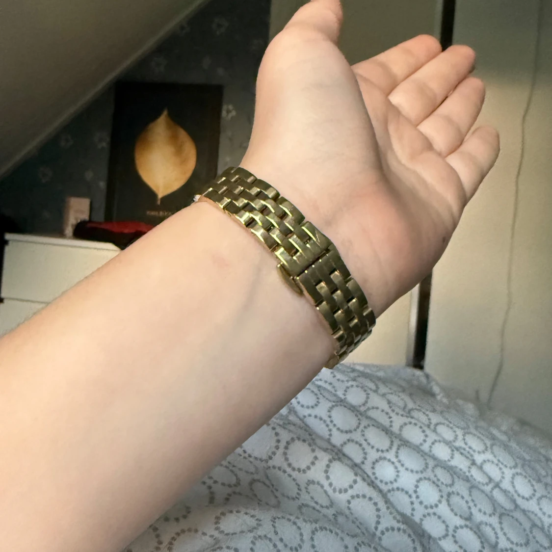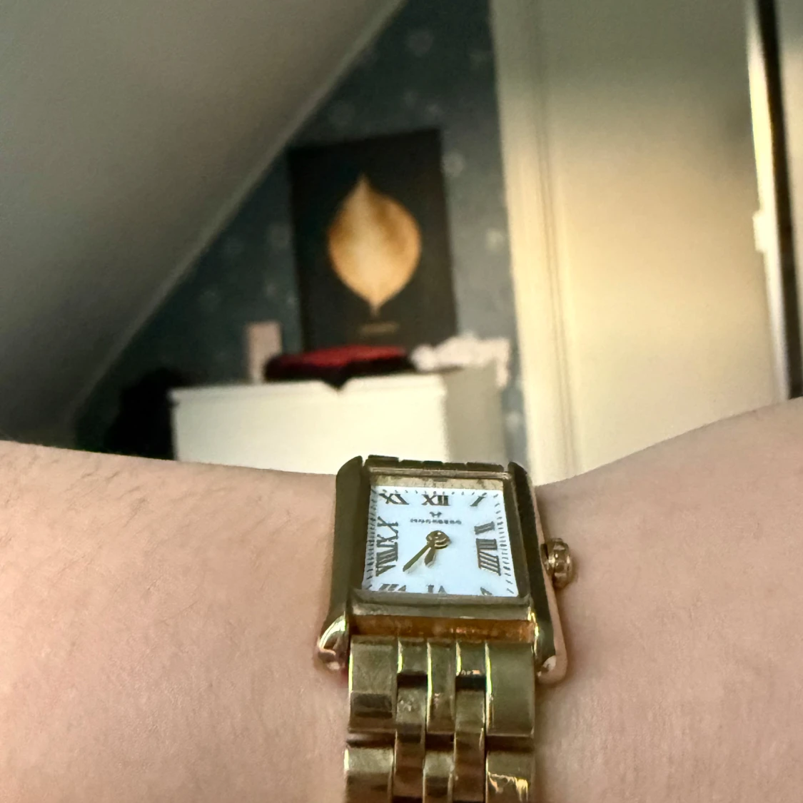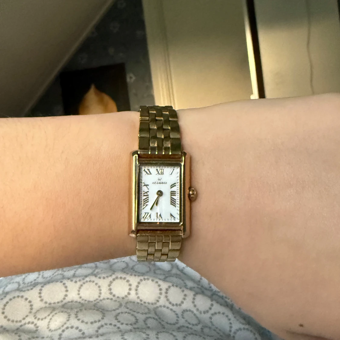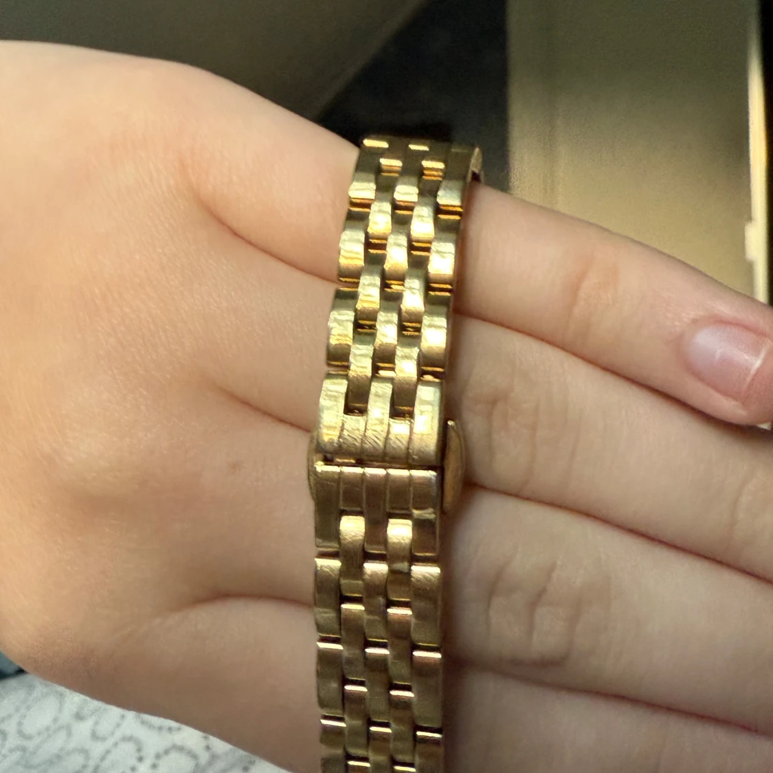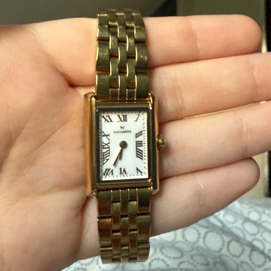 Snygg guldfärgad klocka från mockberg med rektangulärt ur och klassisk länkarmband. Urtavlan är vit med svarta romerska siffror och guldfärgade visare. Klockan har en stilren och tidlös design som passar perfekt för dig som gillar eleganta accessoarer. Har både påsen och förpackningen till den är använd typ 5 gånger