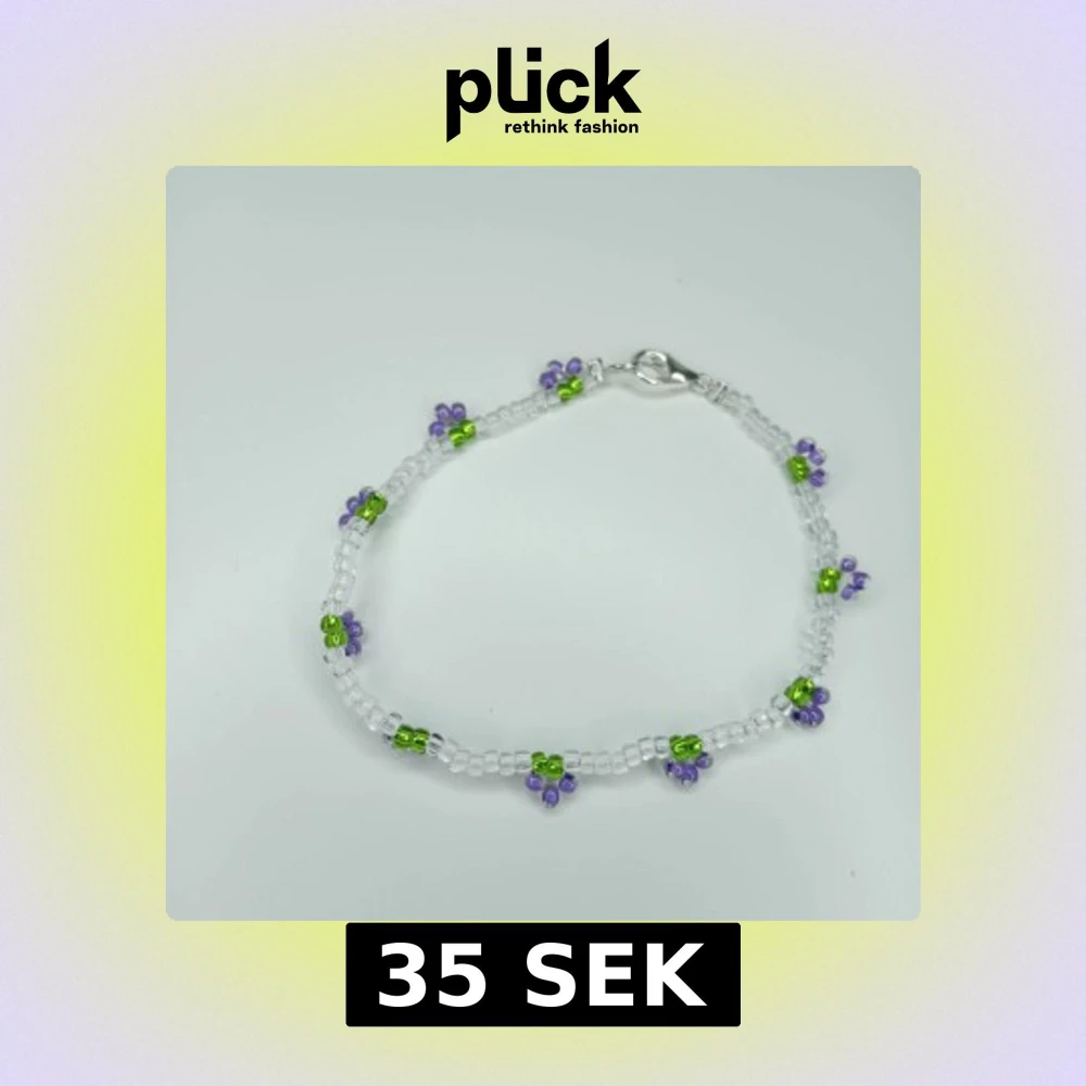 Handgjort armband skapat med pärlor i transparenta, gröna och lila färger. Längd ca 17,5cm