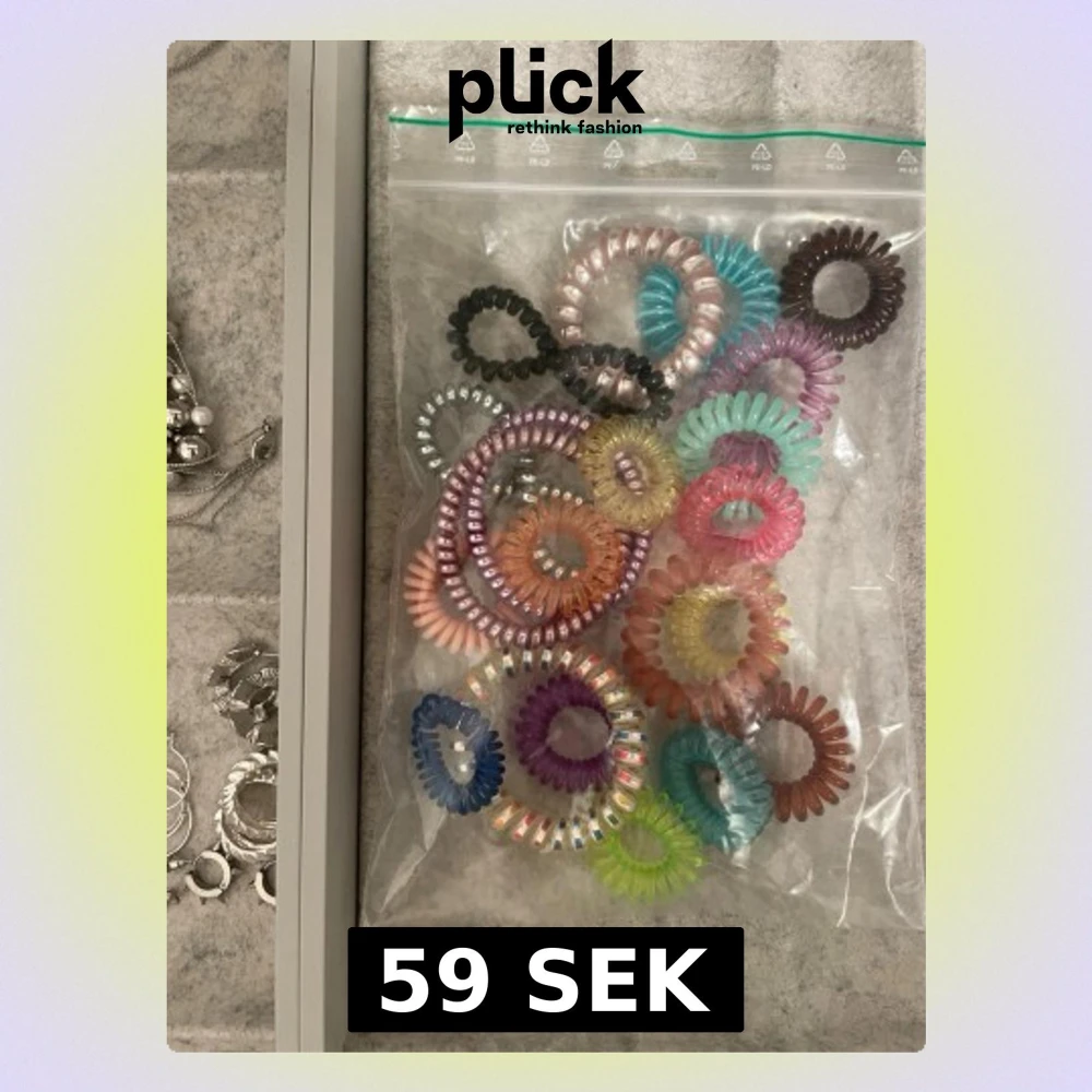 Ett gäng spiralformade hårsnoddar i olika färger som rosa, blå, lila, svart, grön och silver. Perfekta för att sätta upp håret utan att det blir märken.