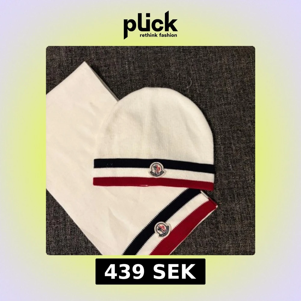 Vit mössa från Moncler med broderad logotyp framtill. Mössan har en marinblå och en röd rand längs nederkanten. Tillverkad i stickat material, perfekt för sommaren då den är lite tunnare! Halsduken ingår med som också är lite tunnare