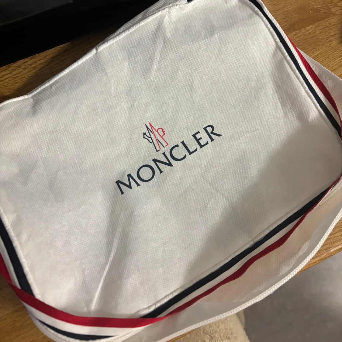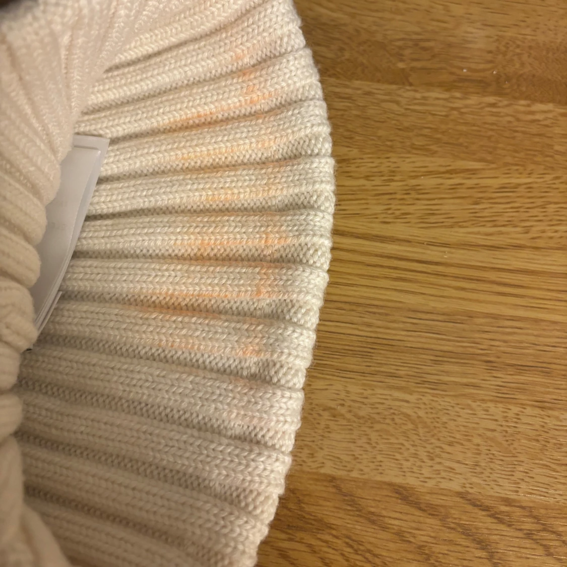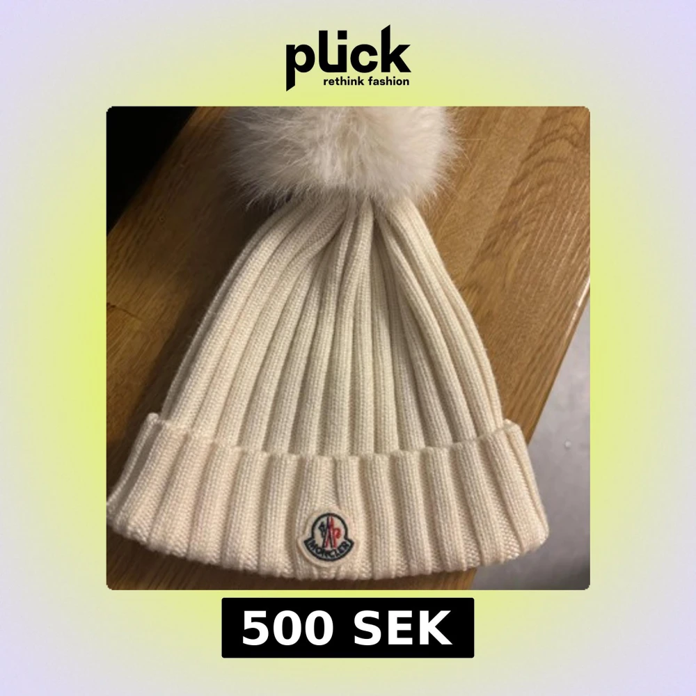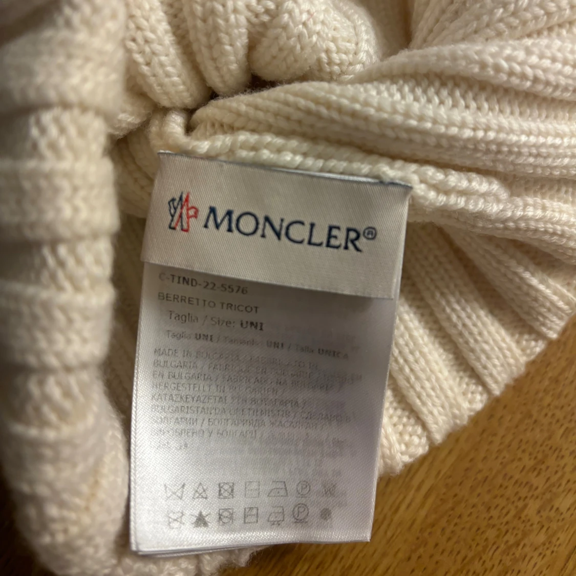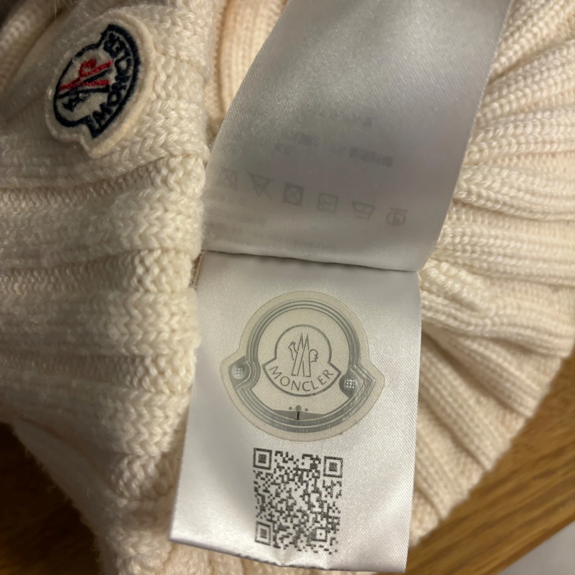 Så fin Moncler mössa med boll, har tyvärr blivit fläckar på insidan av smink men inget som syns när man har på sig den🤍