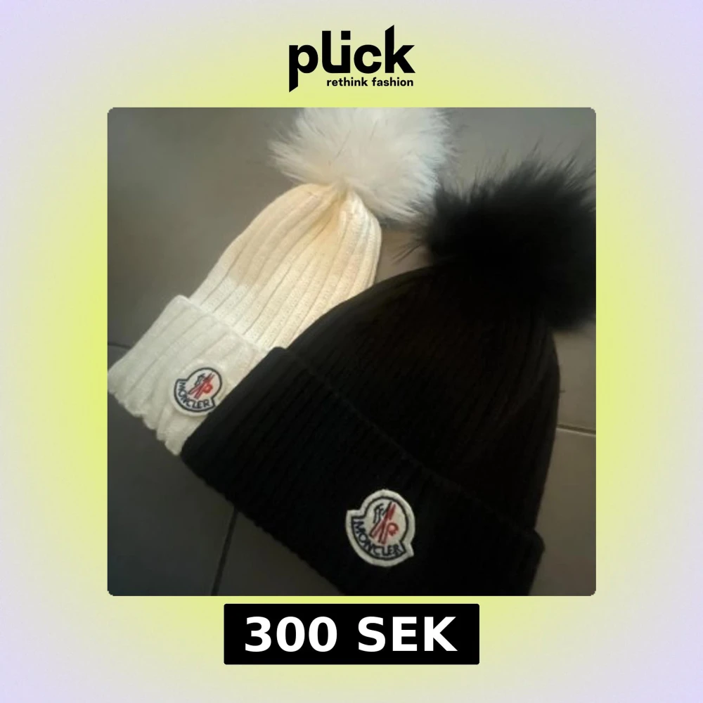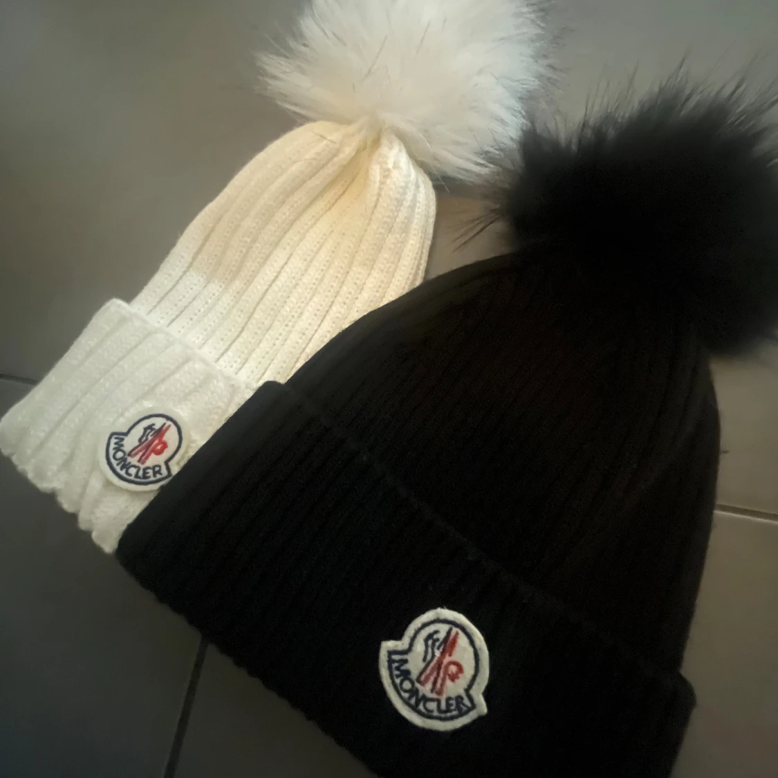 Två ribbstickade Moncler mössor, en vit och en svart, båda med stor fluffig pälsboll på toppen och Moncler-logga framtill. Dock den svarta mössan så är bollen äkta päls men inte den vita! Perfekt för dig som vill ha en snygg och lyxig vinteraccessoar med streetkänsla. 300kr för den vita 500 för den svarta!